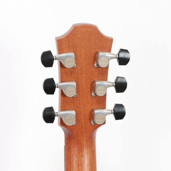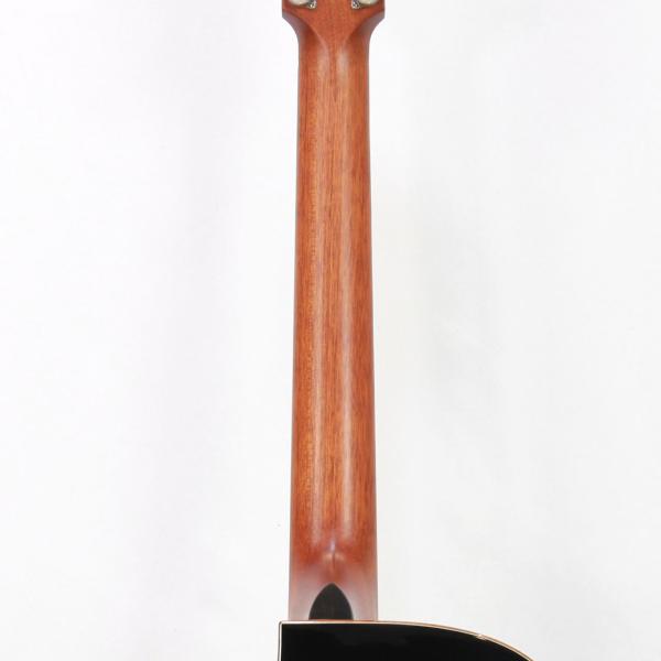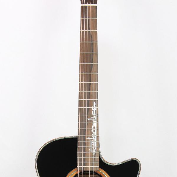 漆黒のボディはイングルマンスプルースとインディアンローズウッドの組み合わせ。ジリコテの指板とブリッジ、ハワイアンコアのバインディング、フィット感を高めるBevel Duo(コンター付ボディ)など魅力的なディテール。オリジナルデザインのインレイは、彼の座右の銘が刻まれている。