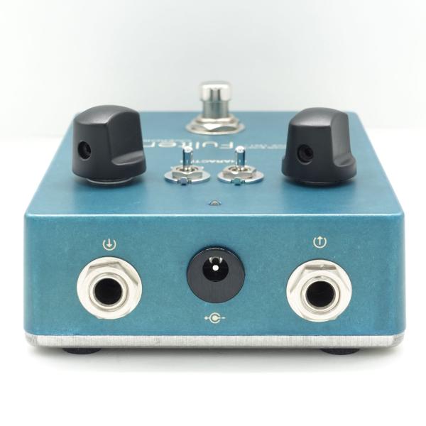 アンプスピーカーの口径や数による音色変化に合わせて、エッジ(高音域のブースト)とボトム(低音域のブースト)の2つのキャラクタースイッチで、音質を補正します。音抜けの良さのポイントは、可変式トーンコントロールを使わず、あえてスイッチでプリセットの周波数帯をブーストすることで、必要最小限の回路しか信号が通過しないことにあります。キャラクタースイッチを両方ONにすると、レンジが広くエッジの効いたハードなドライブサウンドになり、ゲインも上がります。逆に両方OFFの場合、やや甘めのマイルドなサウンドになり、ゲインも低めになります。
