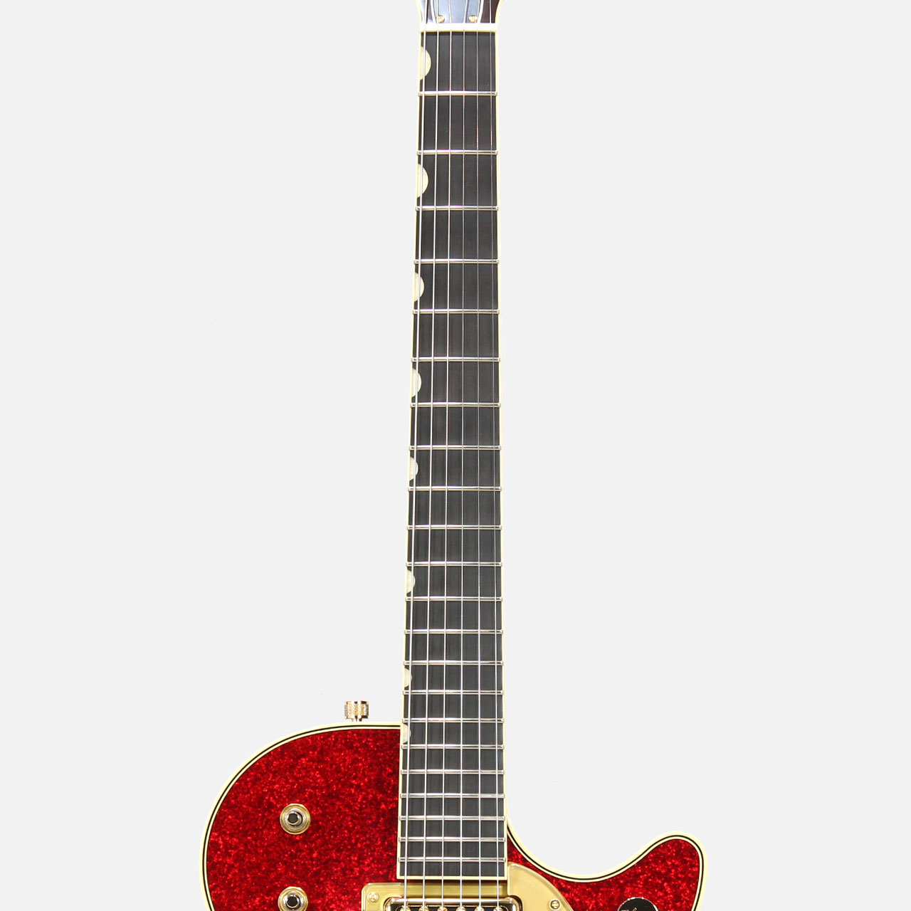 Bigsbyを搭載したG6129T-59Vintage Select '59 Sparkle Jetはその輝かしい偉大な遺産に敬意を表しています。 本機はグレッチのフラッグシップモデル、デュオジェットの昔ながらのレッドスパークルバージョンであり、チェンバード・マホガニーのボディ構造から生まれるシグネイチャーなパワーとパンチを備えます。トップとボディ間の隙間を共鳴させることで、ハーモニックな豊かさを増幅させ、よりはっきりとした明瞭なトーンを実現しています。