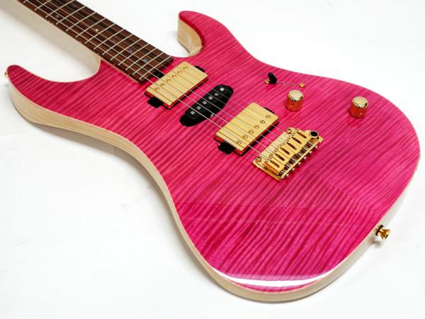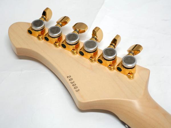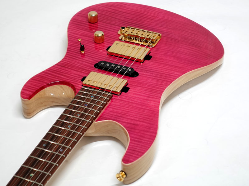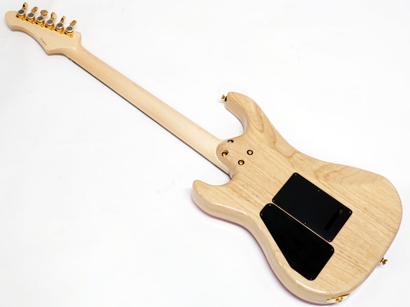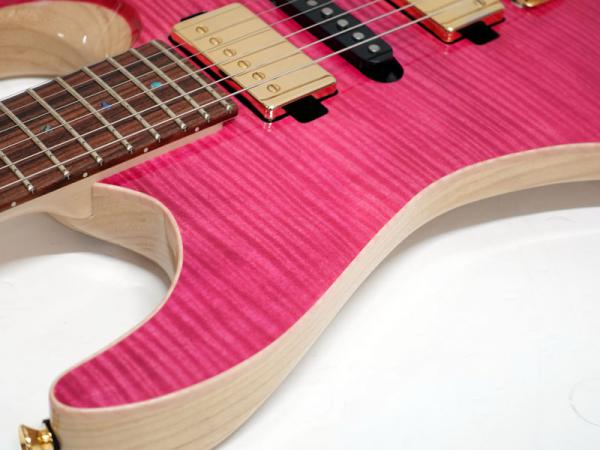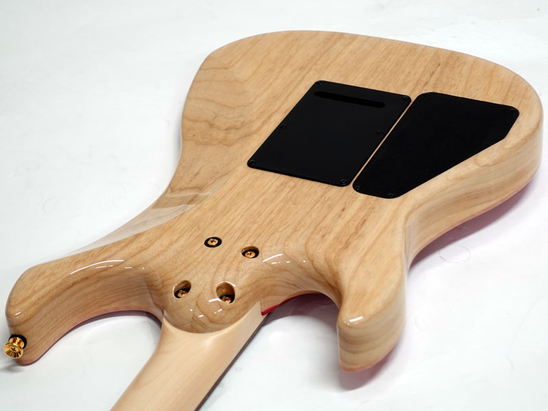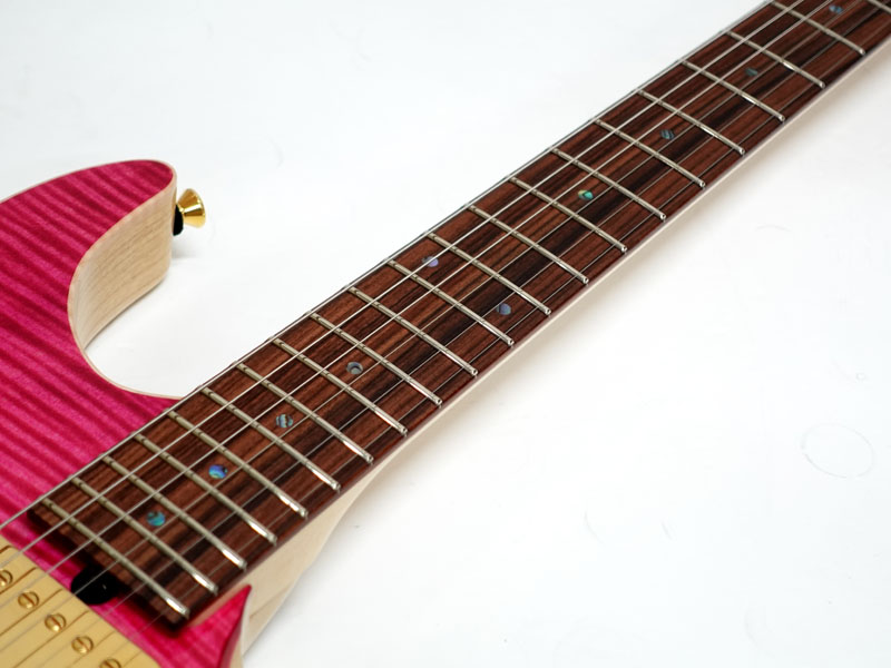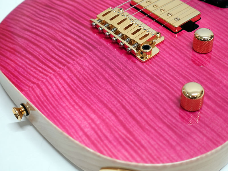 美しい木目のフレイムメイプルトップ、アッシュバック、メイプルネックのパーフェロー指板。薄めのネックシェイプに22フレット、ハイフレットのコンター加工にカスタムショップならではの丁寧な仕上げで演奏性は抜群です。Gotoh製ロックペグに2点支持トレモロ搭載でアームプレイも自在です。