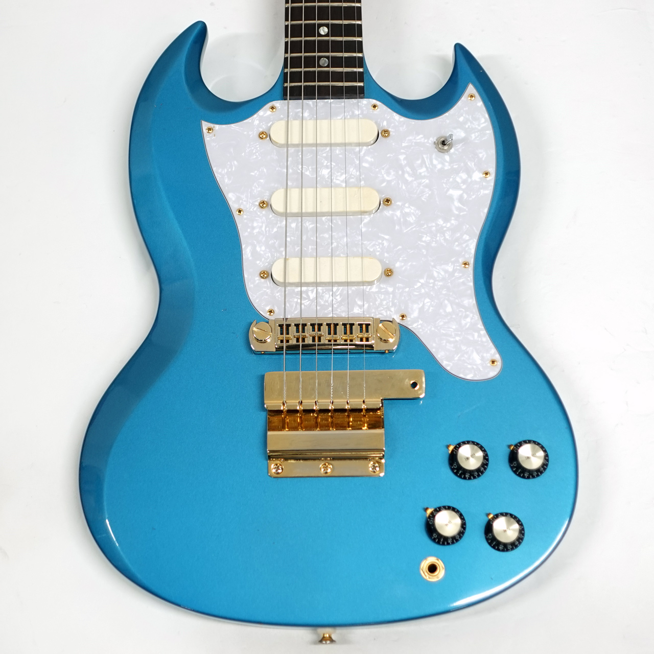 オリジナルからの改造箇所が多く、ピックガード、バックパネル、トラスロッドカバーがホワイトパールに換装、セレクターはスライドスイッチからミニスイッチに交換されています。