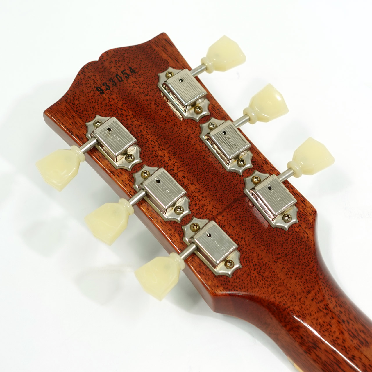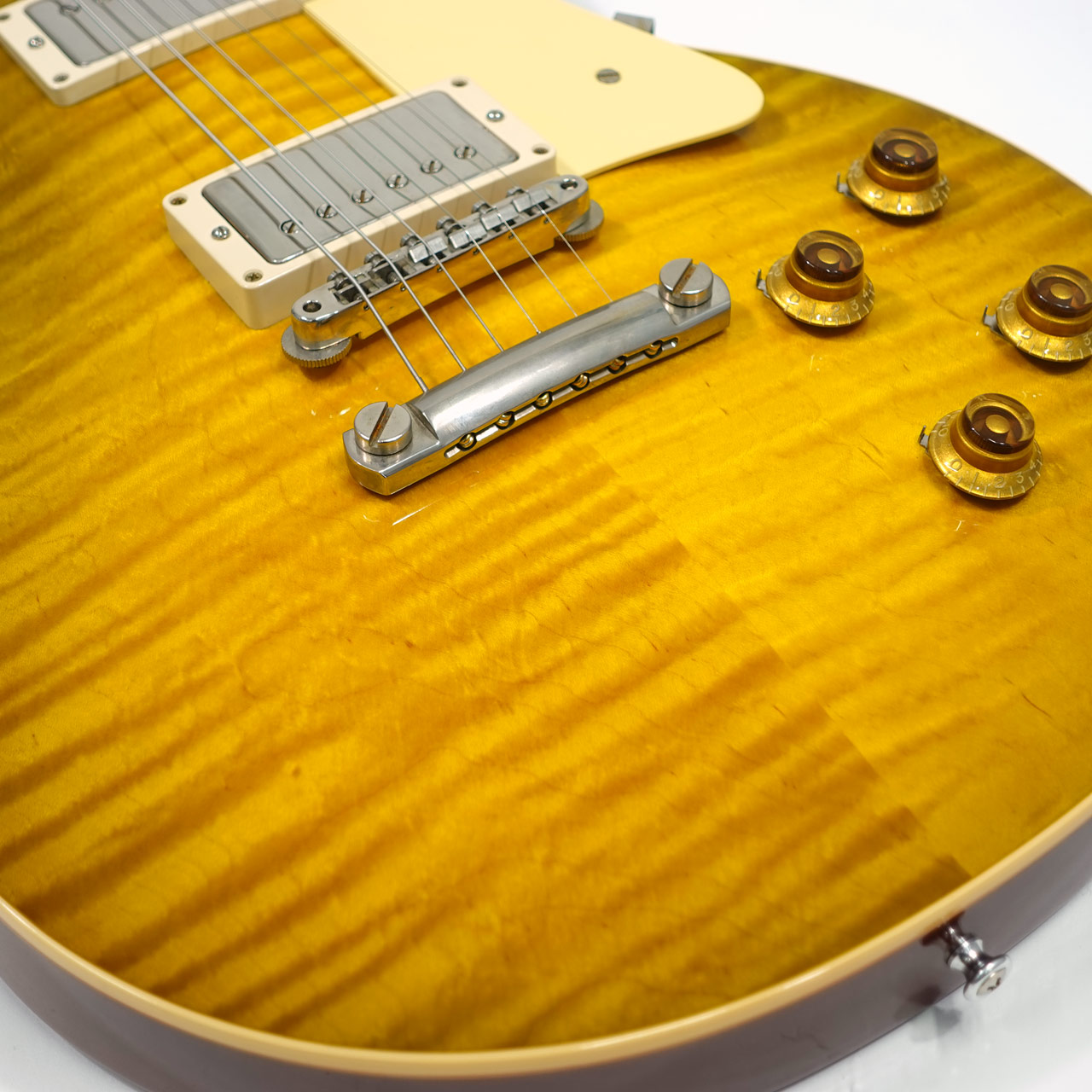 59スペックに相応しいワイドかつ深い杢目のフィギャードメイプルトップに1ピースマホガニーボディ、マホガニーネックにインディアンローズウッド指板。カスタムショップ製らしく伝統のハイドグルーにて接着されています。