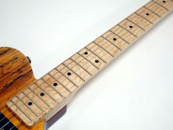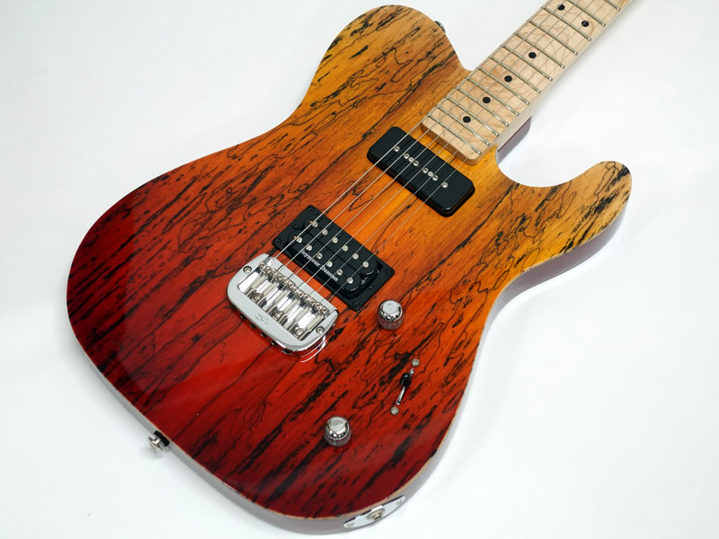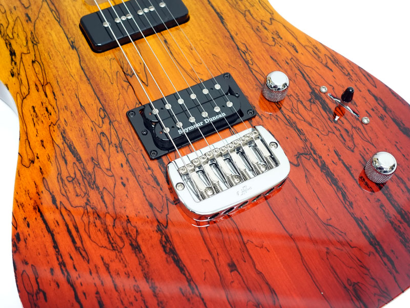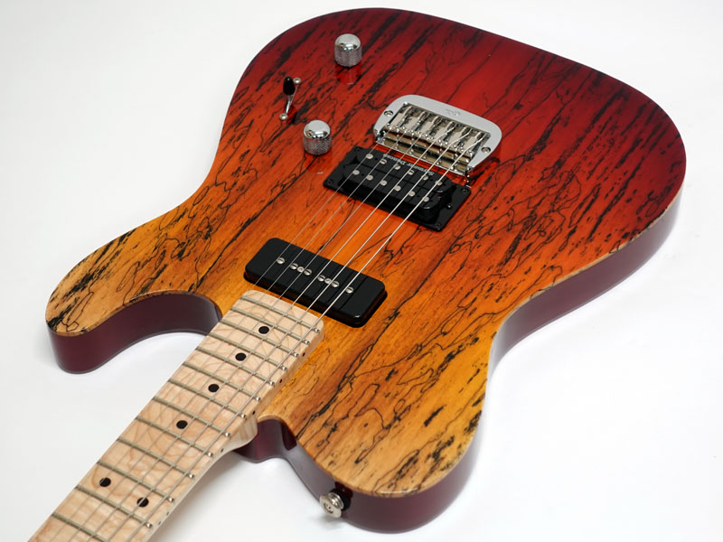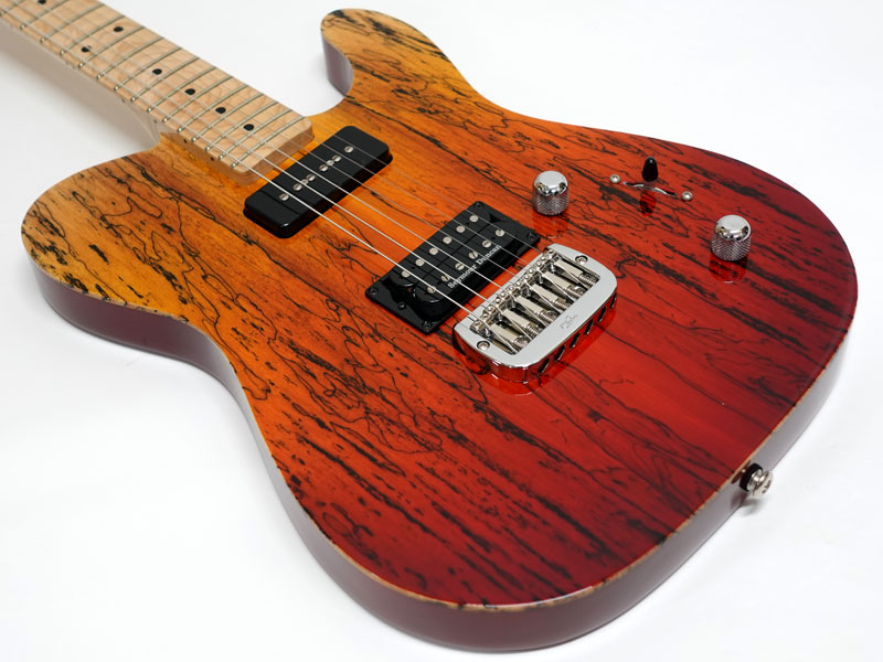 トップにエキゾチックな杢目の出たスポルテッドメイプル、スワンプアッシュボディ。トップはピックガード無しのグラデーションしたファイヤーフェイドフィニッシュで最大限杢目が楽しめます。