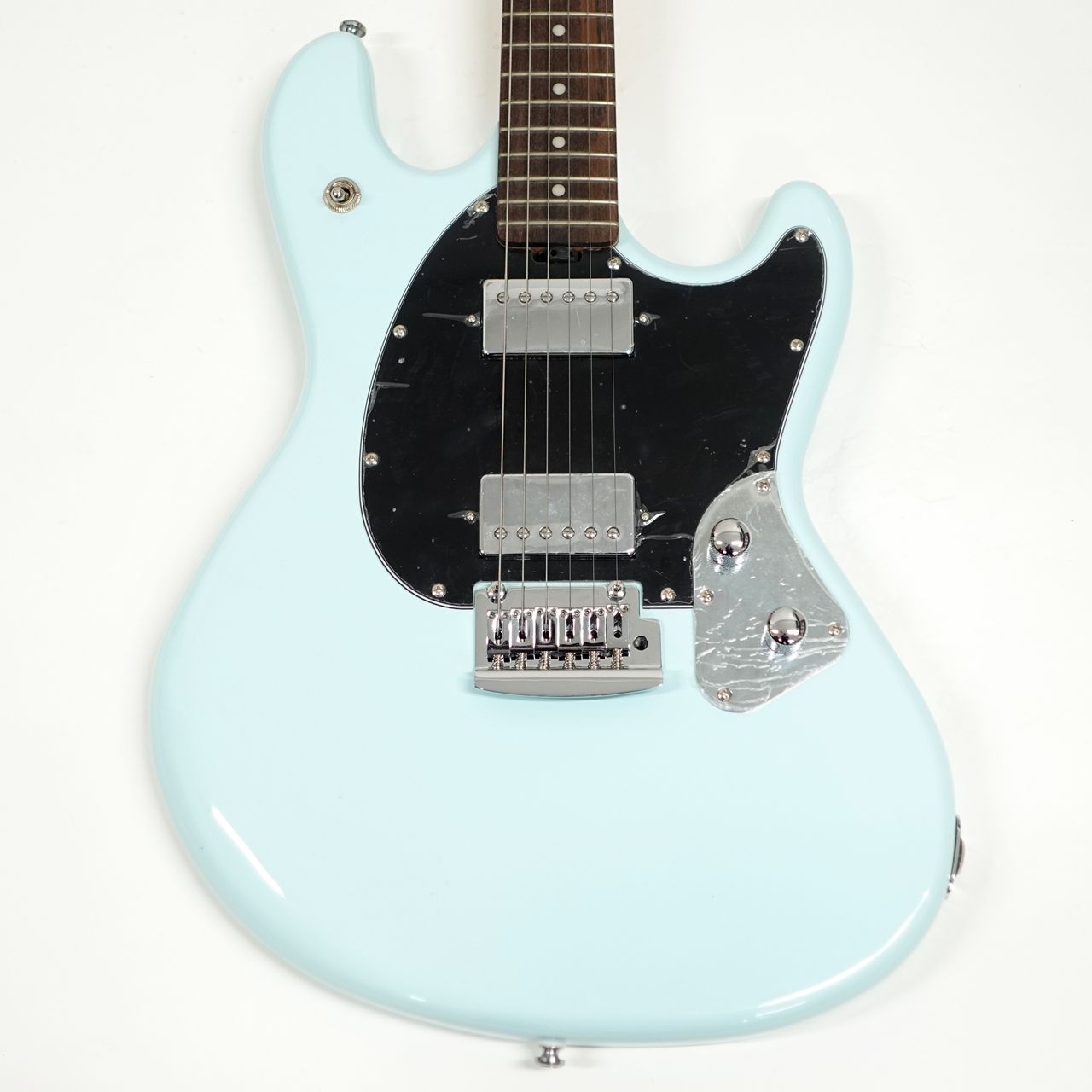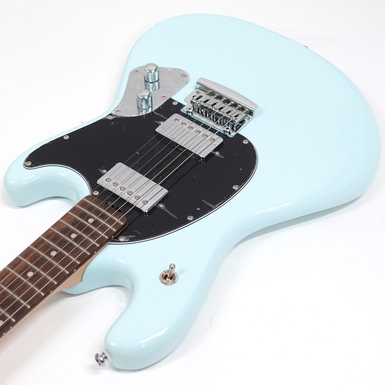 カバードのハムバッカーをピックガードにマウント、2スタッドのトレモロユニットにトグルスイッチと扱いやすさも抜群です。