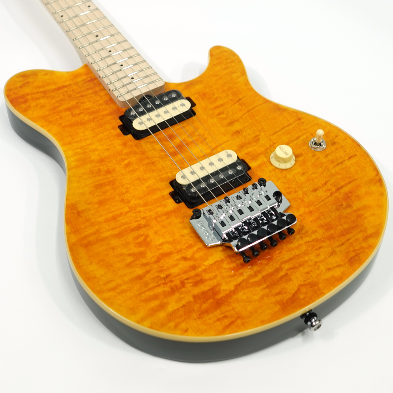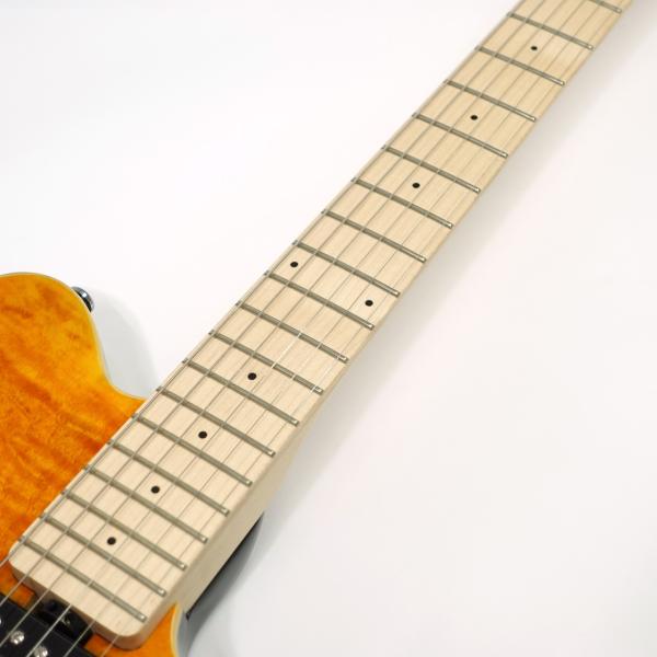 キルテッドメイプルにシースルーカラーと印象的なルックス。ストラトと同じスケールですがアクシスならではのカッタウェイデザイン、5ボルトオン仕様となめらかなヒールカットでハイフレットまで弾きこなせます。1ボリュームならではのいさぎよいコントロールもいいですネ。