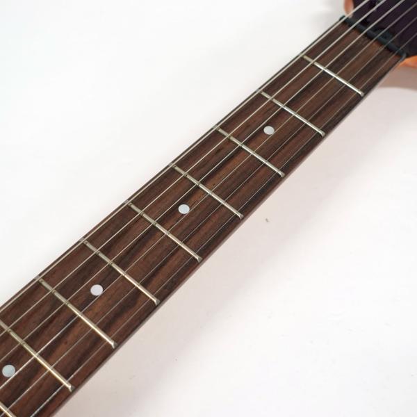 あめ色に塗装されたネックバックや赤べっ甲柄のピックガード、フロントソープバーピックアップとかなりマニアックなスペックを持つこのパシフィカ。ピックアップにはフロントにダンカンのSP90-1、ブリッジはカバードのCustom5を搭載。ヤマハオリジナルのブリッジプレートに、Graph Tech社製String-Saverサドルをマウントしたカスタムブリッジを搭載。