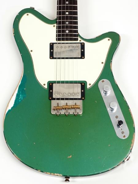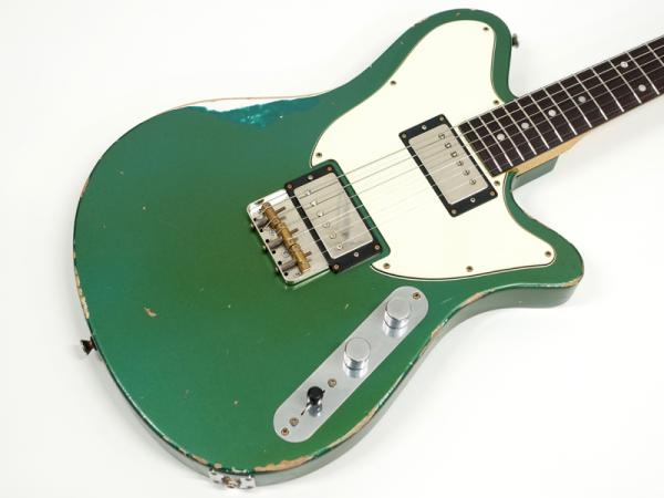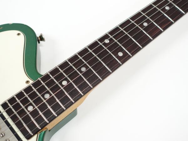 フィニッシュにオールニトロセルロースラッカーのシャーウッドグリーンをセレクトし、フルレリック仕様にてオーダーしました。レリック具合に関してはFCGRの熟練の塗装職人のセンスに「お任せ」する形で上がってきましたが、リアルなレリックの剥げ具合やトップコートが焼けたシャーウッドグリーンから覗く本来のグリーンカラーや下地のホワイトと渋さ抜群のルックスとなりました。