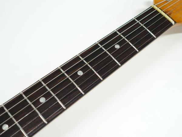 オリジナルシェイプのライトアッシュボディにメイプルネック、インディアンローズウッド指板。ロングスケールに22F、指板Rも緩めでモダンな演奏性を持ちます。