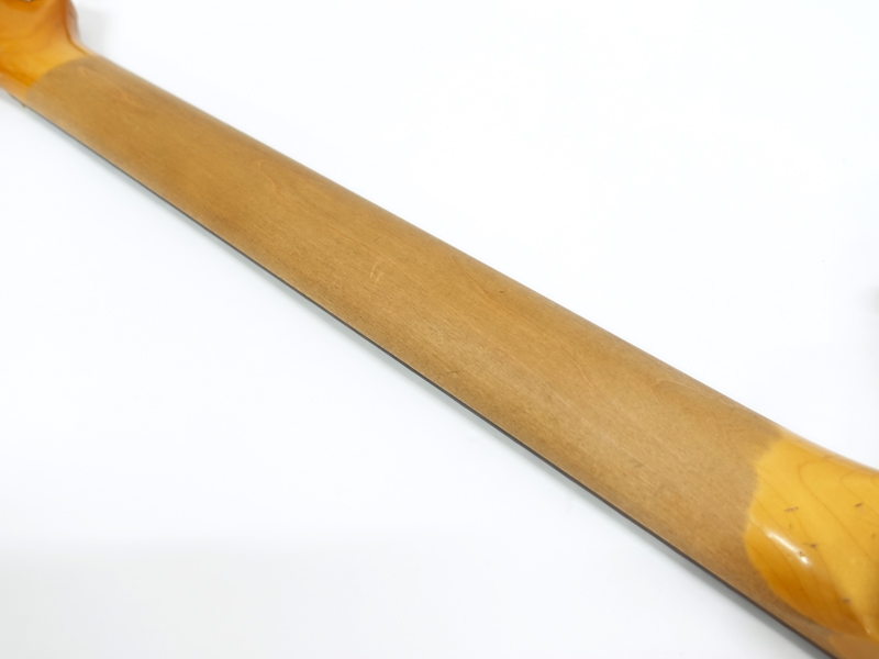 オリジナルシェイプのライトアッシュボディにメイプルネック、インディアンローズウッド指板。ロングスケールに22F、指板Rも緩めでモダンな演奏性を持ちます。