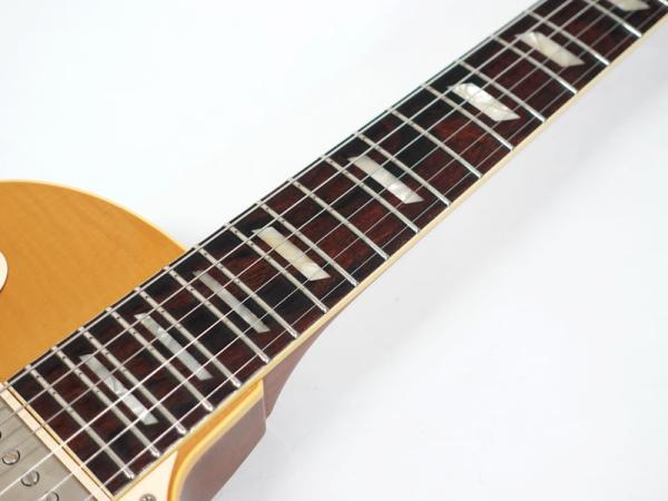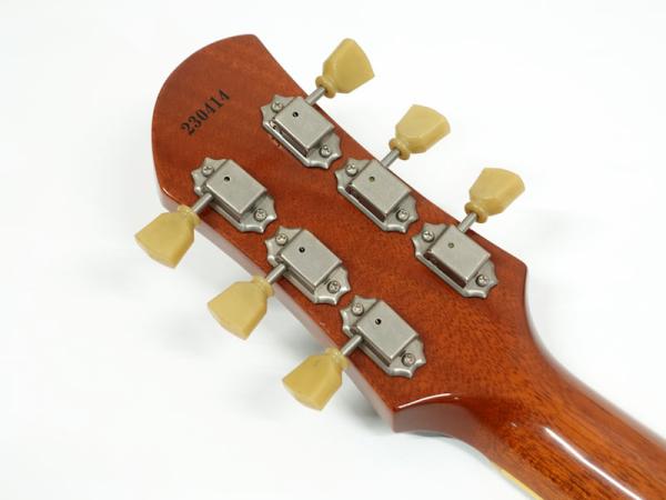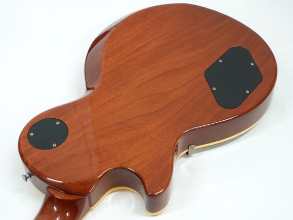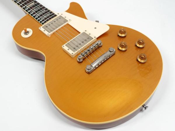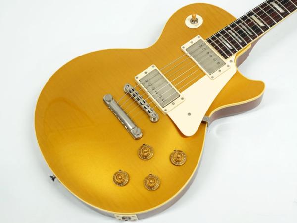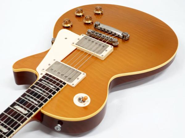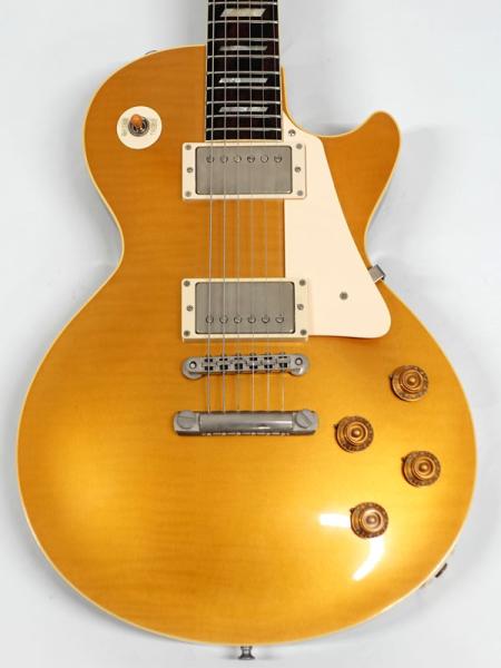 選定したフィギュアドメイプルをあえてのゴールドトップ仕様、それをビンテージのゴールドトップにみられるラッカー塗装の引きによって下地のフィギュアドが浮き出てくるようなルックスを再現。非常にマニアックで渋い仕上がりとなっています。