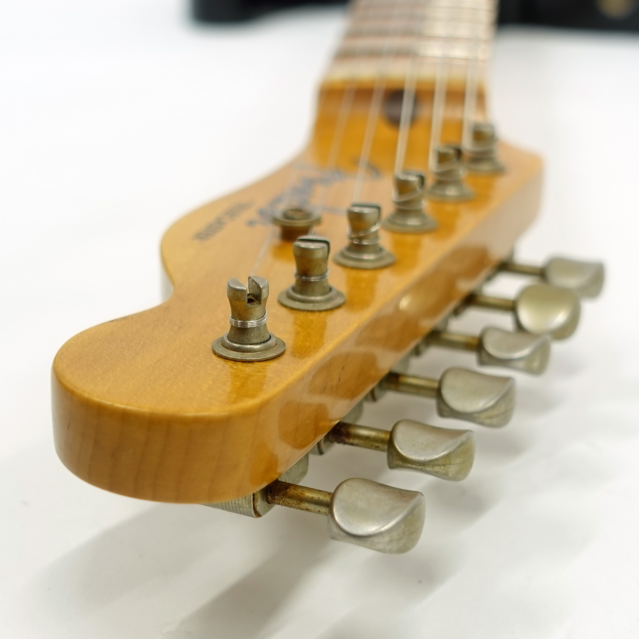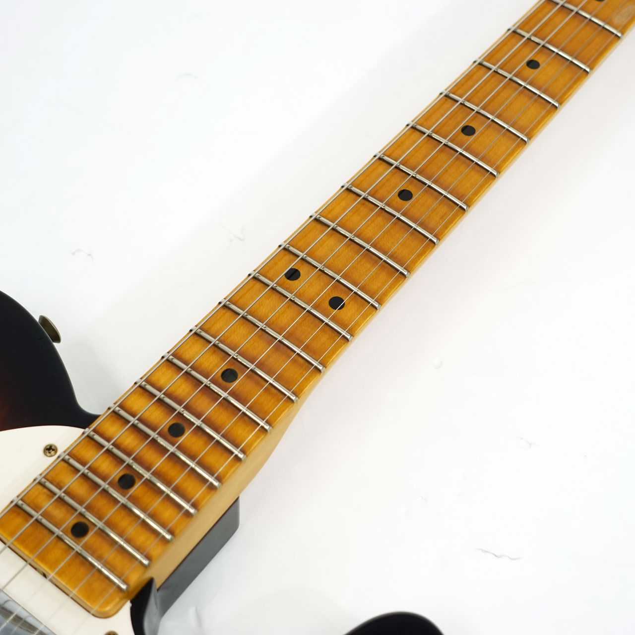 こちらの個体もウェザーチェックは美しく表現されておりメイプルフィンガーボードも長年使用されてきたようなルックスでカスタムショップの職人の意気込みを感じる仕上がりとなっています。