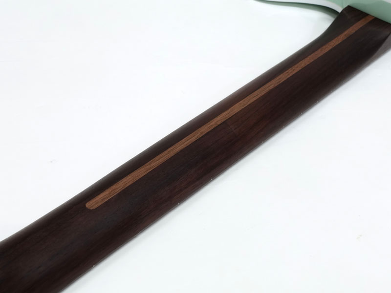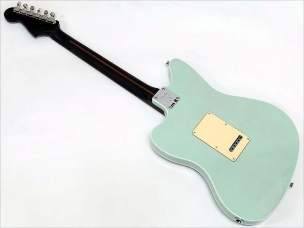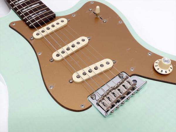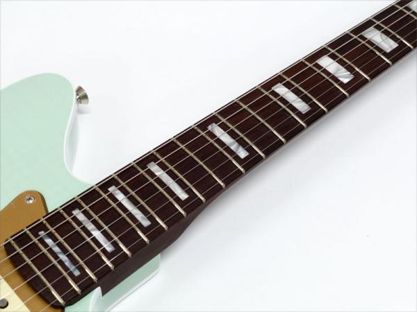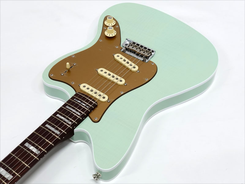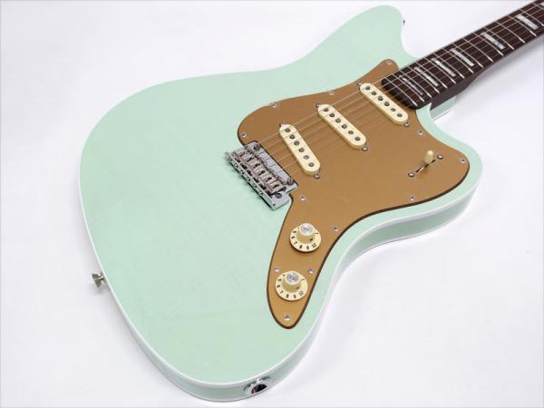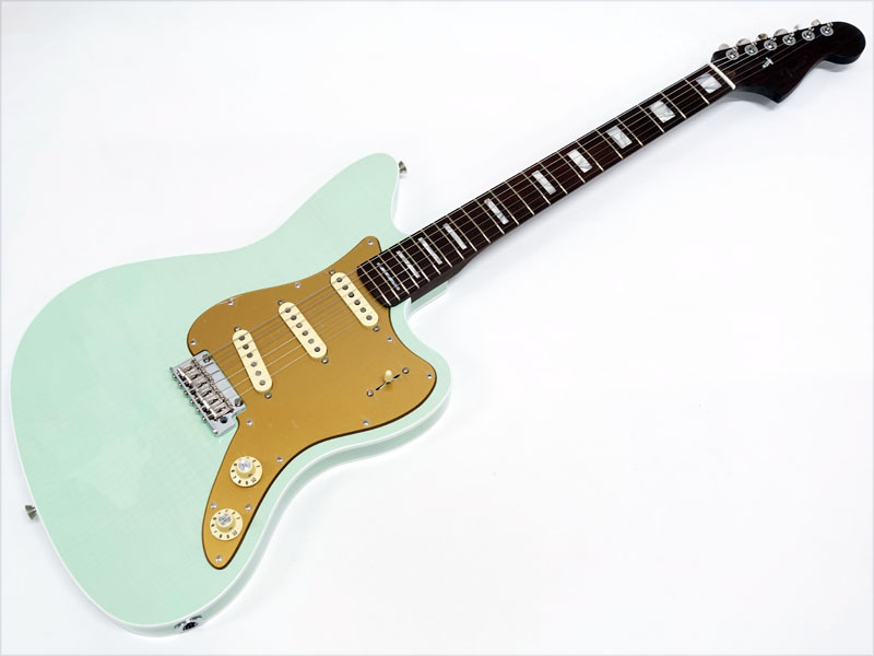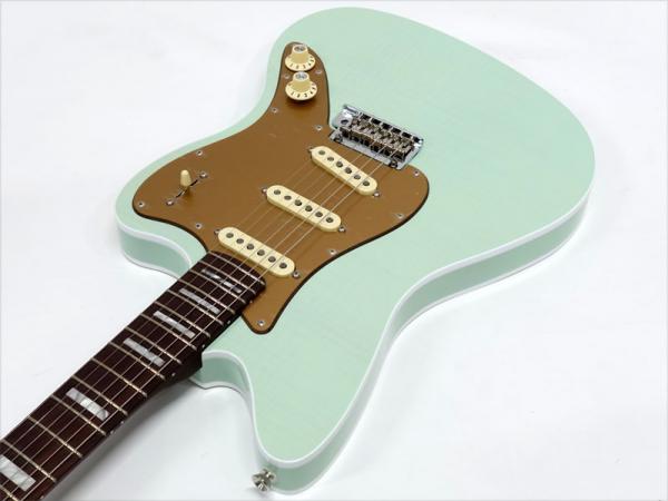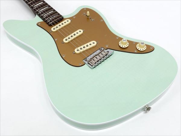 バインディングが施されたJazzmasterシェイプのアルダーボディにはフレイムメイプルトップがあしらわれ、トランスペアレント仕上げのフェードシーフォームグリーンで杢目と独特に色味に個性を感じます。ネックには希少なローズウッド1Pネックをサテン仕上げにし、刻印されたヘッドロゴやホワイトパーロイドのブロックポジションで高級感のあるルックス。ローズウッドネックを握ればとても高い満足感が得られます。