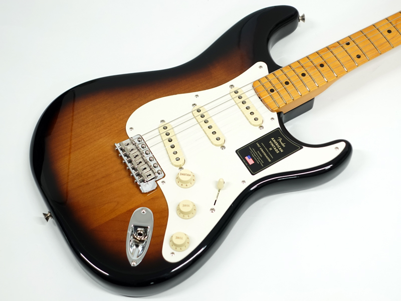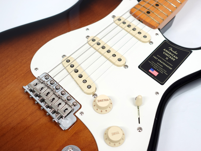 American Vintage II 1957 StratocasterはPure Vintage 57 Stratocasterピックアップを3基搭載し滑らかなボディコンター、7.25インチラジアスのメイプル指板を備えたVシェイプネックが特徴で1957年に存在していたオリジナルモデルのトーンとフィーリングを再現しています。また、コールドロールド(冷間圧延)スチールブロックとベントスチールサドルを備えたPure Vintage Synchronized Tremolo、Fender Deluxeチューニングマシン、1-plyピックガードなどのプレミアムな仕様が採用されています。