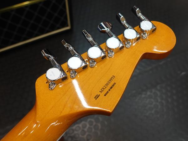ストラトのヘッド形状に50年代風のFenderロゴ(スパロゴ)、バインディングが施された指板にドットのポジションマークは本家フェンダーだからこそ再現可能な仕様。