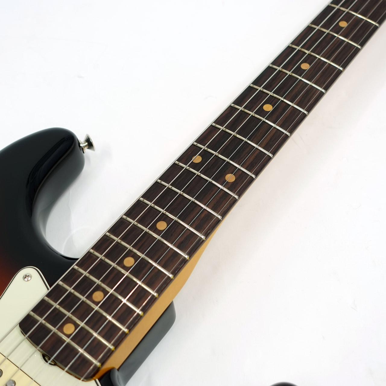 50年代後期から60年代初期にかけて、フェンダー製品は市場の人気を席巻し、ギターのラインナップが急速に多様化していく中においても、Stratocasterは依然として人気の頂点に君臨していました。1961年には、Stratocasterはより洗練された美しさを纏い、より鮮やかな赤と大胆な黒の縁取りを持つ3-Color Sunburstが主流のモデルとなり、Stratocasterの曲線を強調する3-plyピックガードが採用されるようになりました。