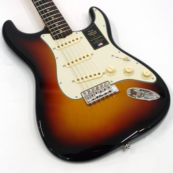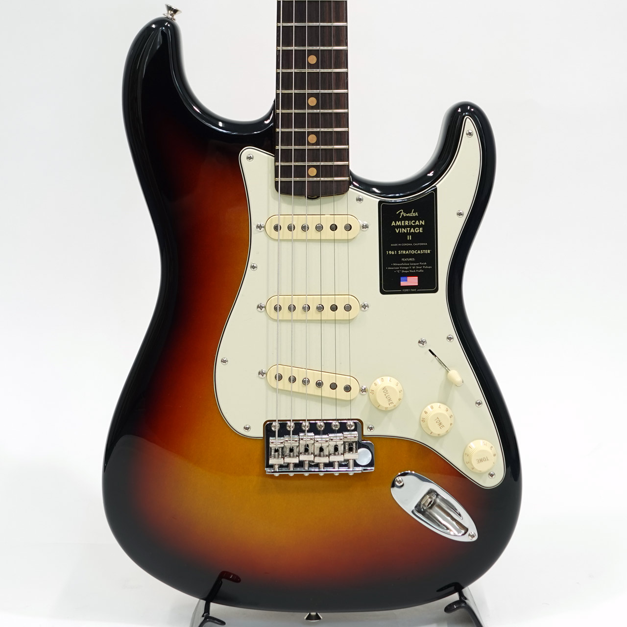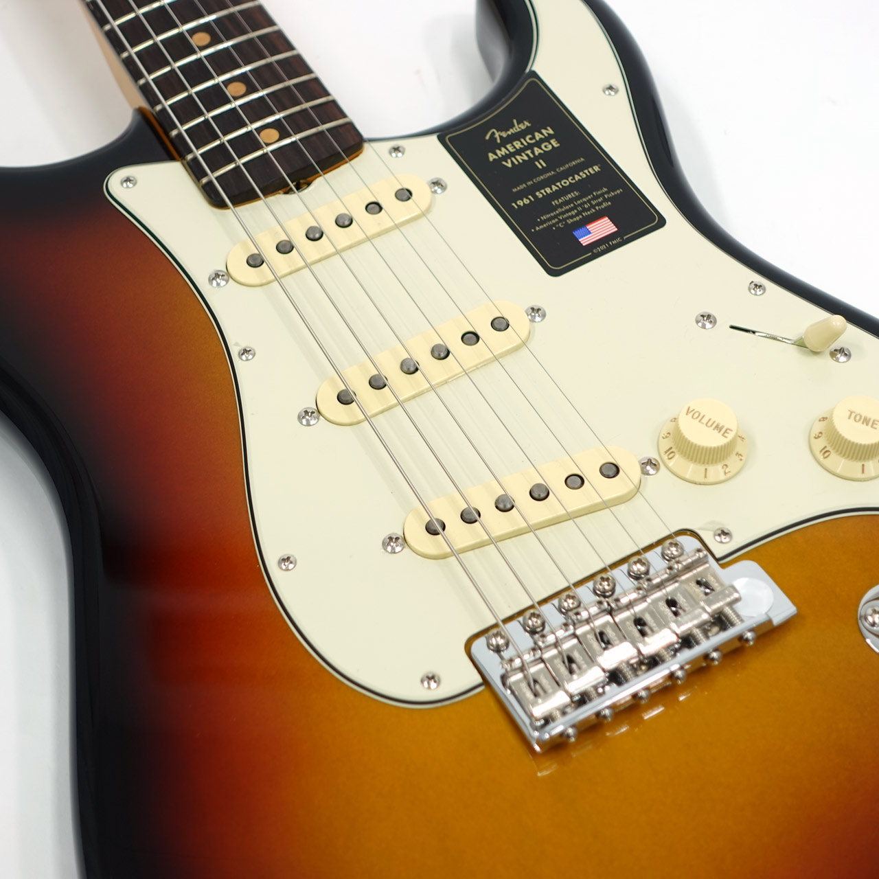American Vintage II 1961 StratocasterはPure Vintage '61 Stratocasterピックアップを3基搭載し、オールラッカーフィニッシュを採用したアルダーボディ、メイプルネック、7.25インチラジアスのスラブローズ指板を備えた1961 “C”シェイプネックが特徴で、1961年に存在していたオリジナルモデルのトーンとフィーリングを再現しています。また、コールドロールド(冷間圧延)スチールブロックとベントスチールサドルを備えたPure Vintage Synchronized Tremolo、Fender Deluxeチューニングマシン、3plyピックガードなどのプレミアムな仕様が採用されています。
