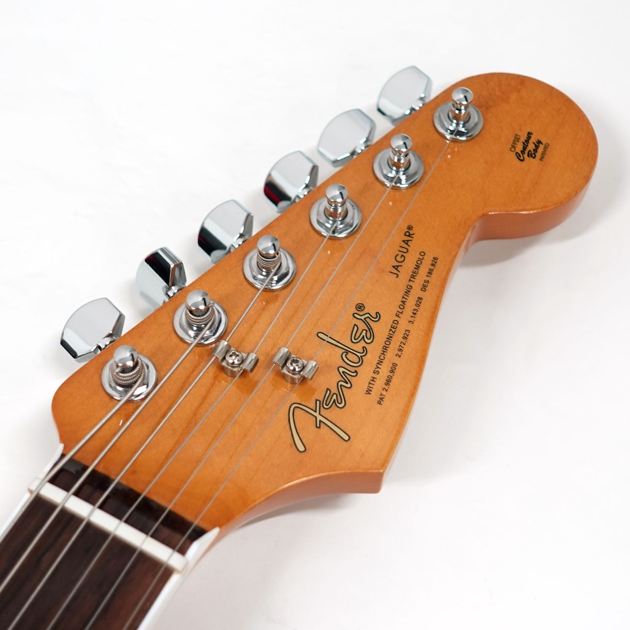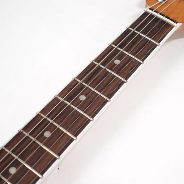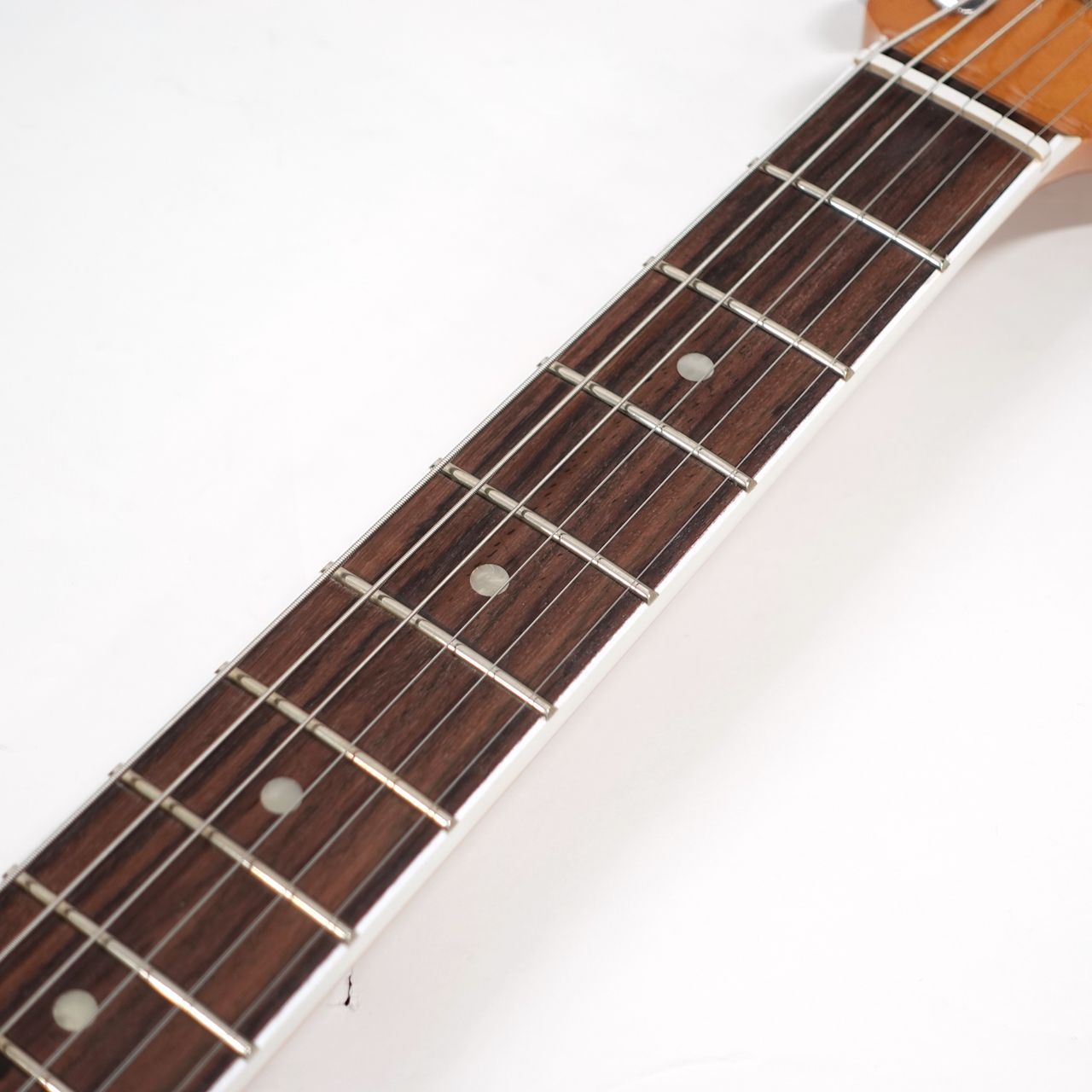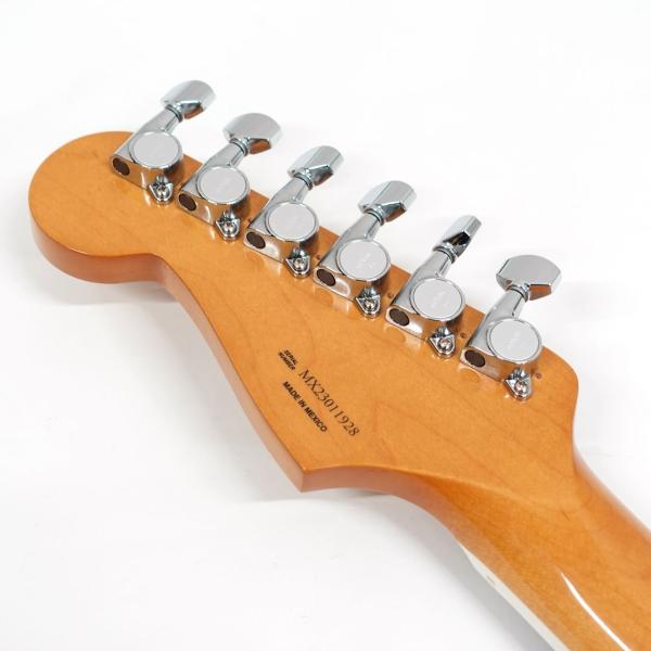 ストラトのヘッド形状に50年代風のFenderロゴ(スパロゴ)、バインディングが施された指板にドットのポジションマークは本家フェンダーだからこそ再現可能な仕様。