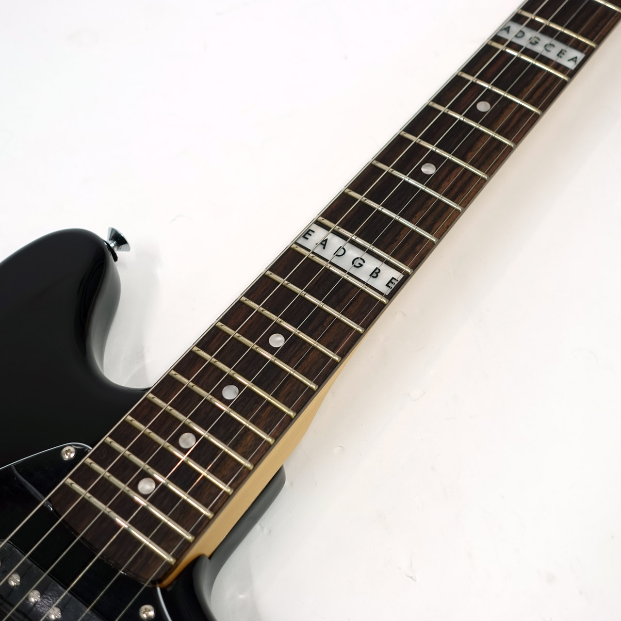 マッチングのブラックカラーにはブラックのピックガードを搭載。また、5 & 12フレットにはMotoがデザインしたポジションのノートをアルファベットで表記したユニークなインレイが採用されています。