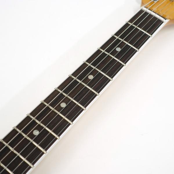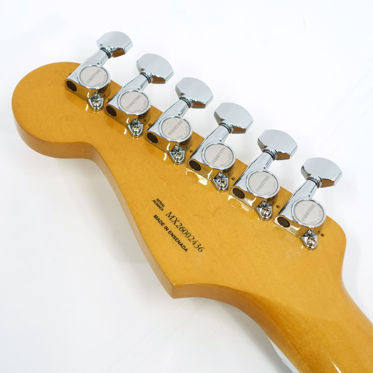 ストラトのヘッド形状に50年代風のFenderロゴ(スパロゴ)、バインディングが施された指板にドットのポジションマークは本家フェンダーだからこそ再現可能な仕様。