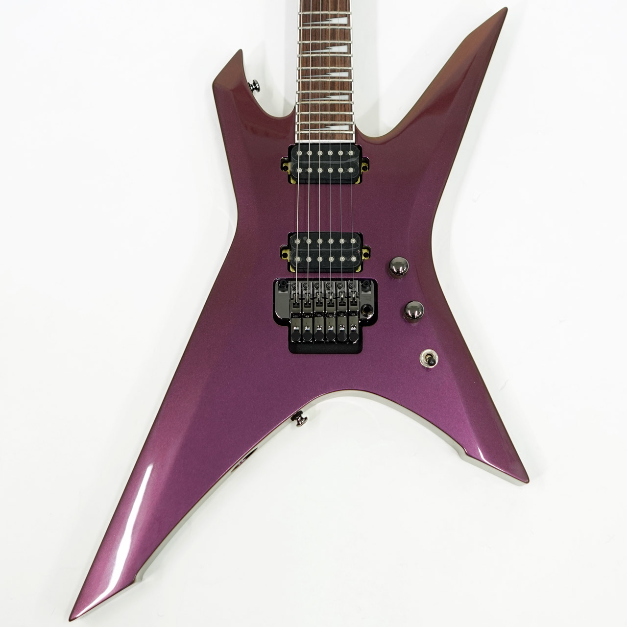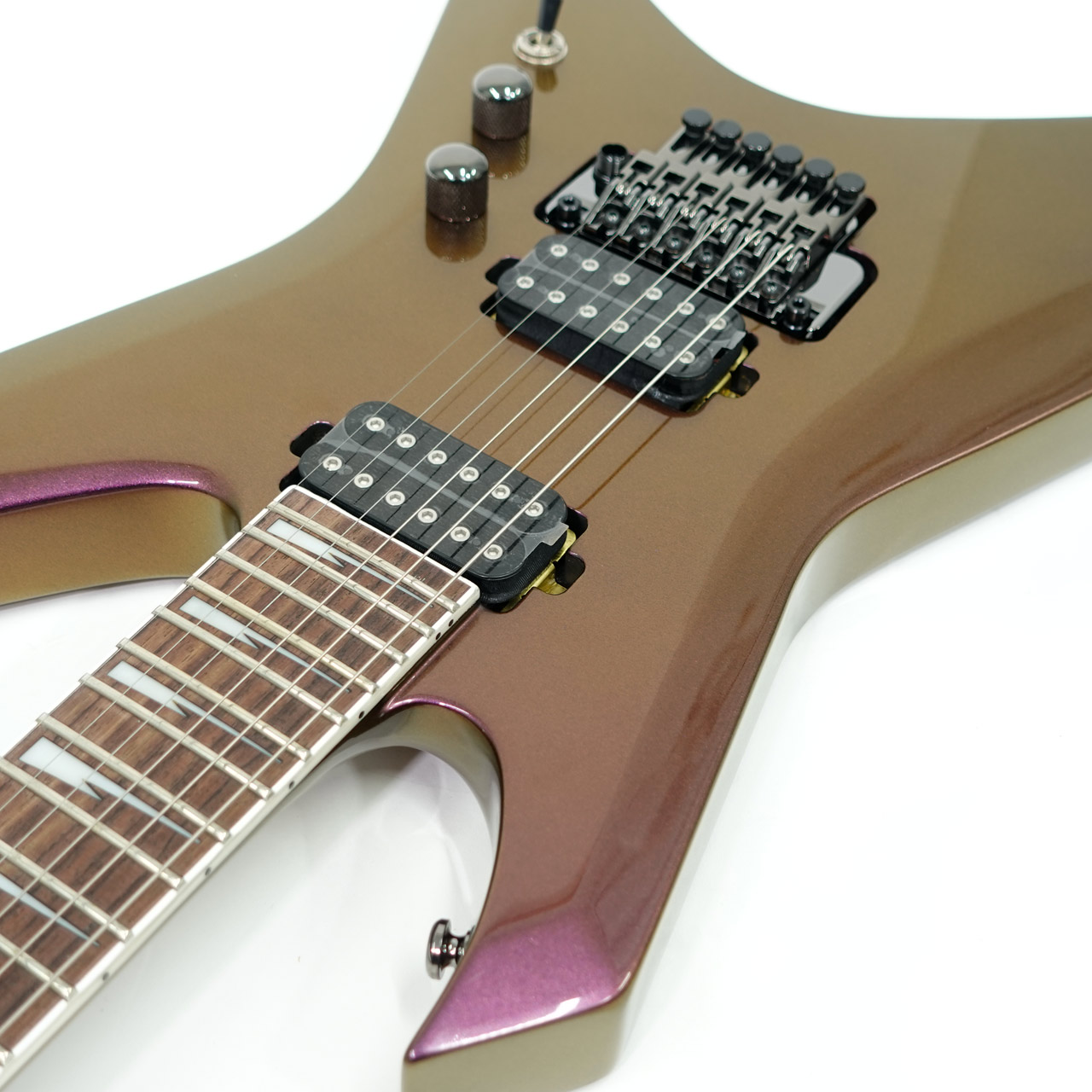 Xを象った変形ボディはトップ、バック共にコンターが施され、見た目の印象以上に身体への負荷が少ない演奏性の高さがあります。
