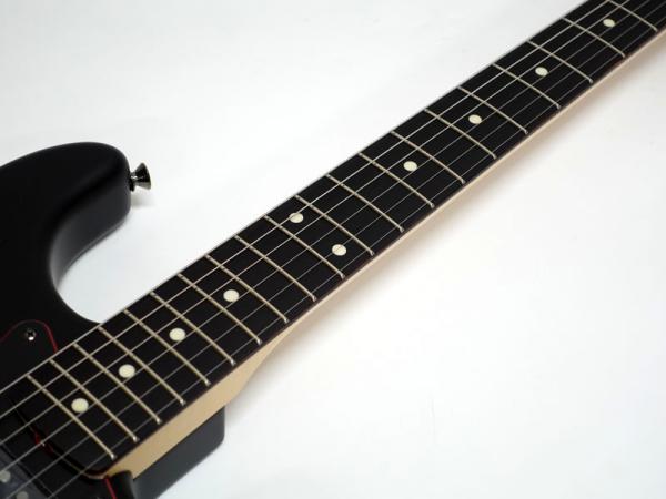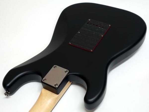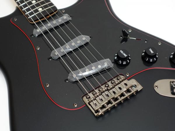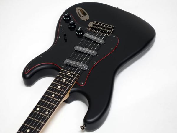 クラシックなFenderスタイルのモデルをベースに力強いルックスを持たせるためのサテンブラックフィニッシュのマッチングヘッド仕上げと、目を引くレッドのセンターレイヤーを纏った3-Plyブラックピックガードを搭載しており、ヘッドのレッドメタルロゴと相まって特別な雰囲気のあるモデルです。 金属パーツやプラスチックパーツは全てブラックで統一しており、ナットもSynthetic Boneを搭載。よりヘビーな見た目になっています。ナロートールフレットを装備した9.5インチラジアス指板がモダンで快適なプレイアビリティを提供します。