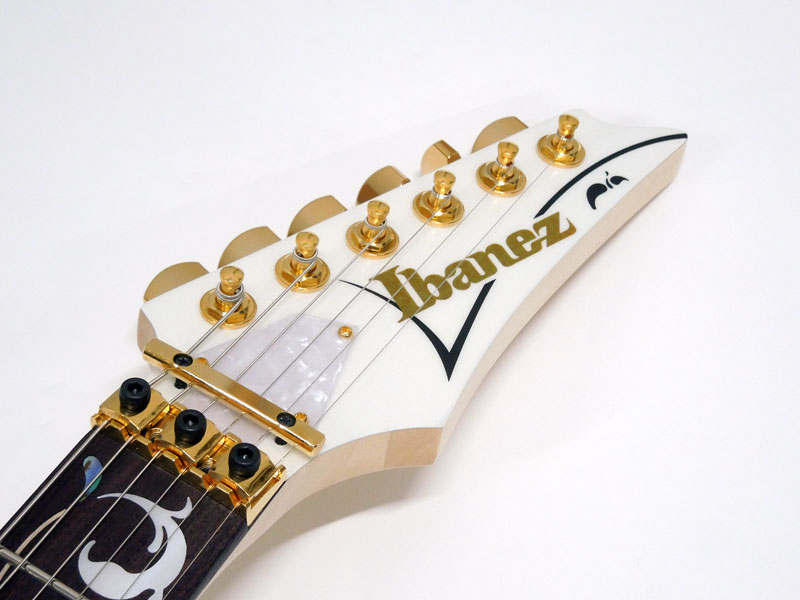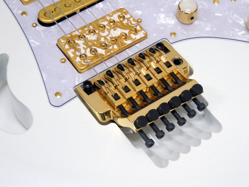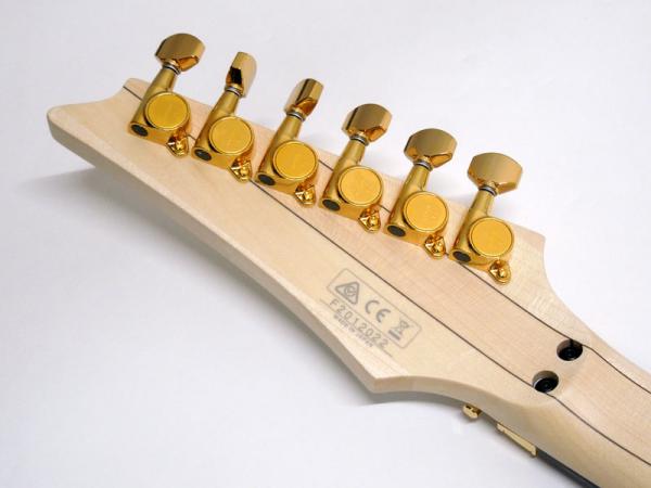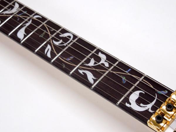 - JEM同様にスティーヴが好むグリップにシェイピングしたメイプル材/ウォルナット材5pc構造のPIAネック - グリップと共にスティーヴ・ヴァイ・モデルを象徴するアートとなる PIAブラッサム・インレイ