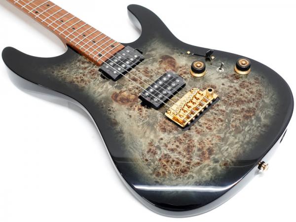 オリジナルのボディ形状を採用したバスウッドボディにポプラバールトップ、ローステッドメイプルネック&指板、ネック形状は従来のネックより少し厚く設計、弾きやすいオイルフィニッシュ仕上げにしています。Ibanezの薄ネックが苦手な方にも手に馴染むような適度な厚さです。