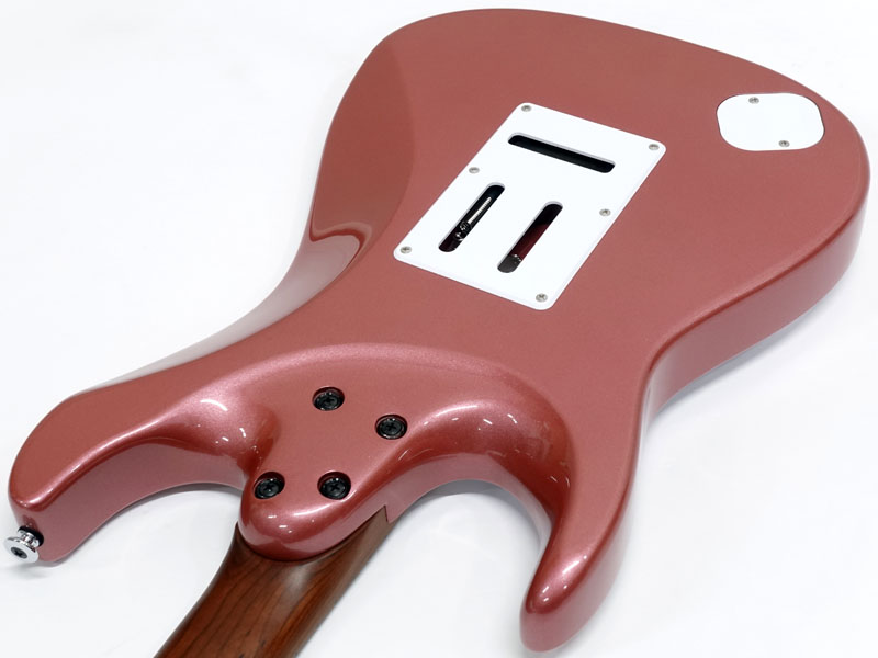 GOTOH製マグナムロックペグ、シンクロトレモロ、ステンレスフレット、ボディのコンターやネックジョイント部の球面仕上げ、蓄光素材のサイドポジションマークなど現代的な演奏性の高さを求めてひと手間ふた手間かけた拘りの感じられる一本。