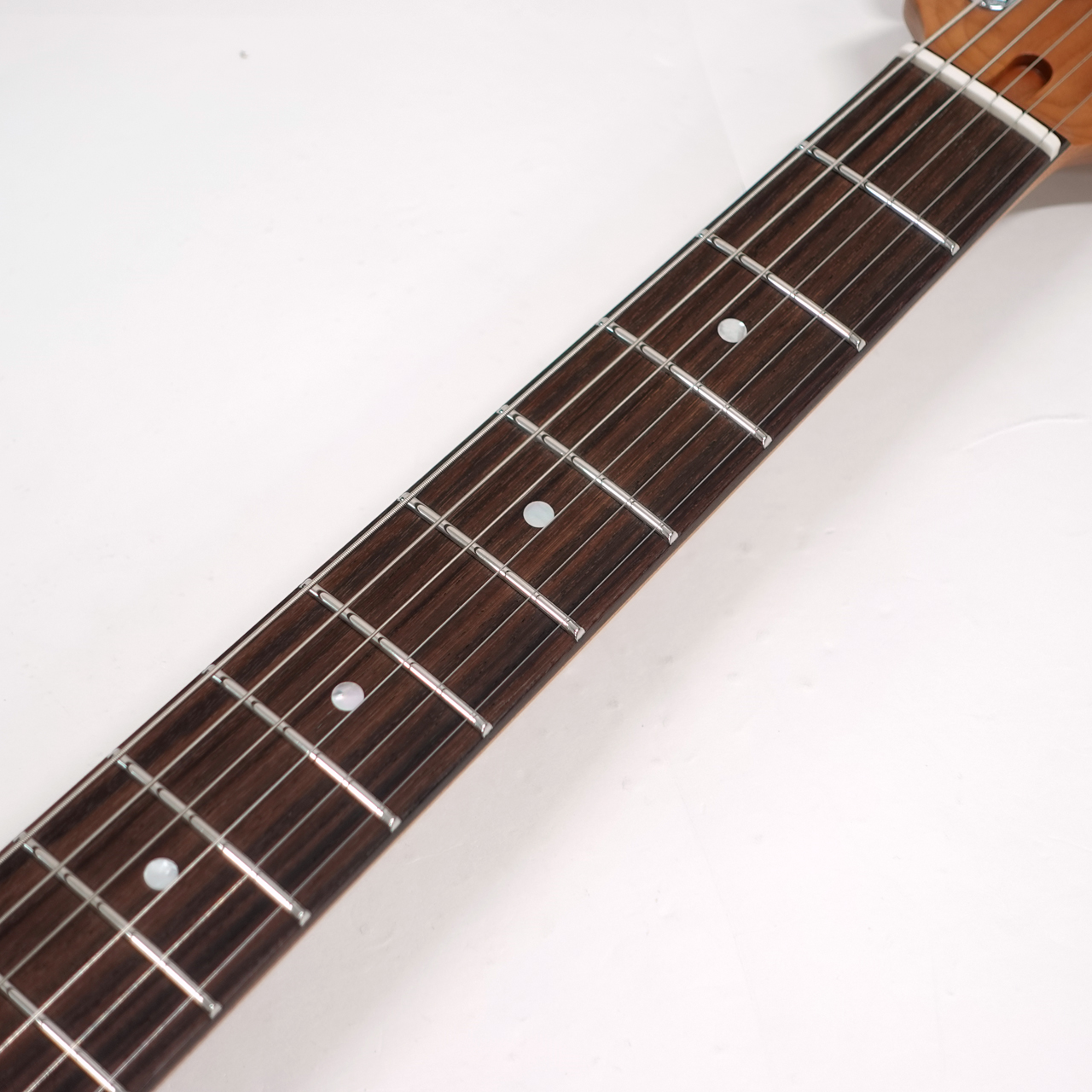 GOTOH製マグナムロックペグ、シンクロトレモロ、ステンレスフレット、ボディのコンターやネックジョイント部の球面仕上げ、蓄光素材のサイドポジションマークなど現代的な演奏性の高さを求めてひと手間ふた手間かけた拘りの感じられる一本。