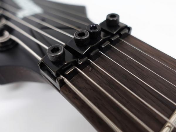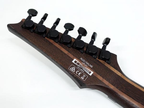 マッカーサーエボニー指板の24フレットにロックトレモロ仕様。ハードなアームプレイにも対応可能なヘヴィな7弦。