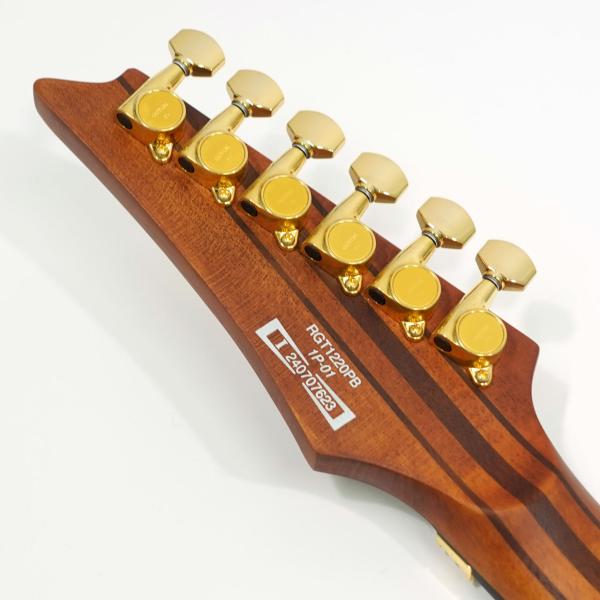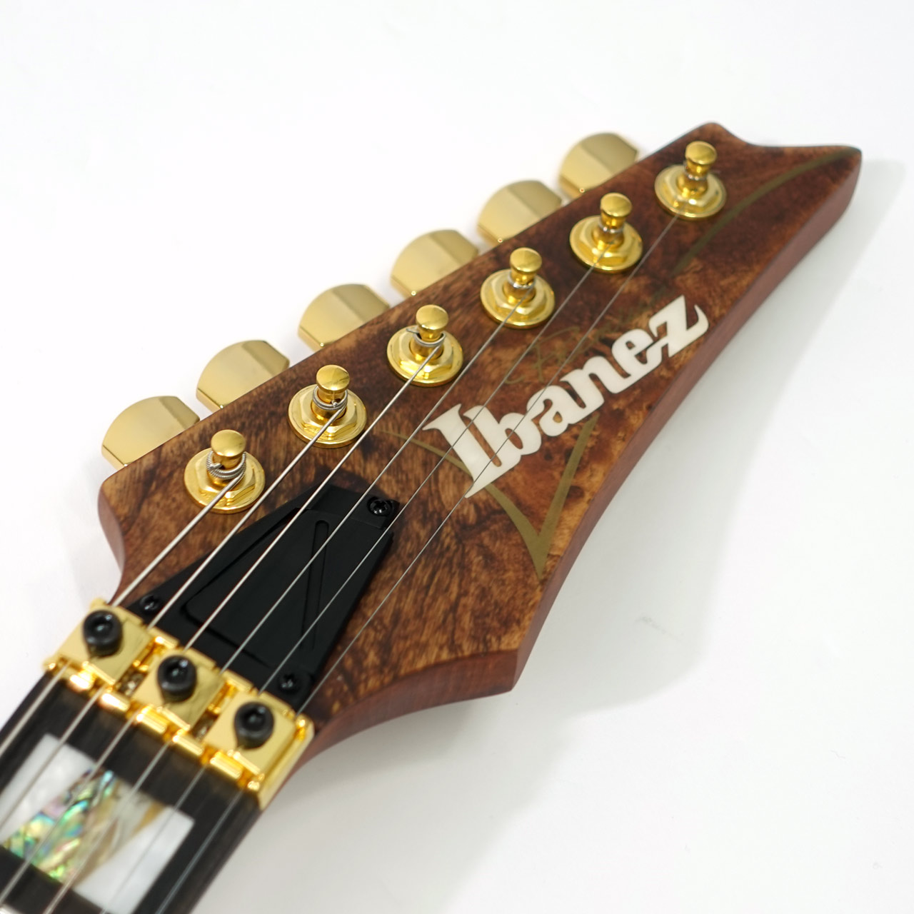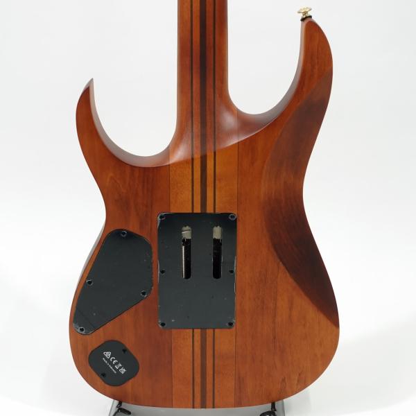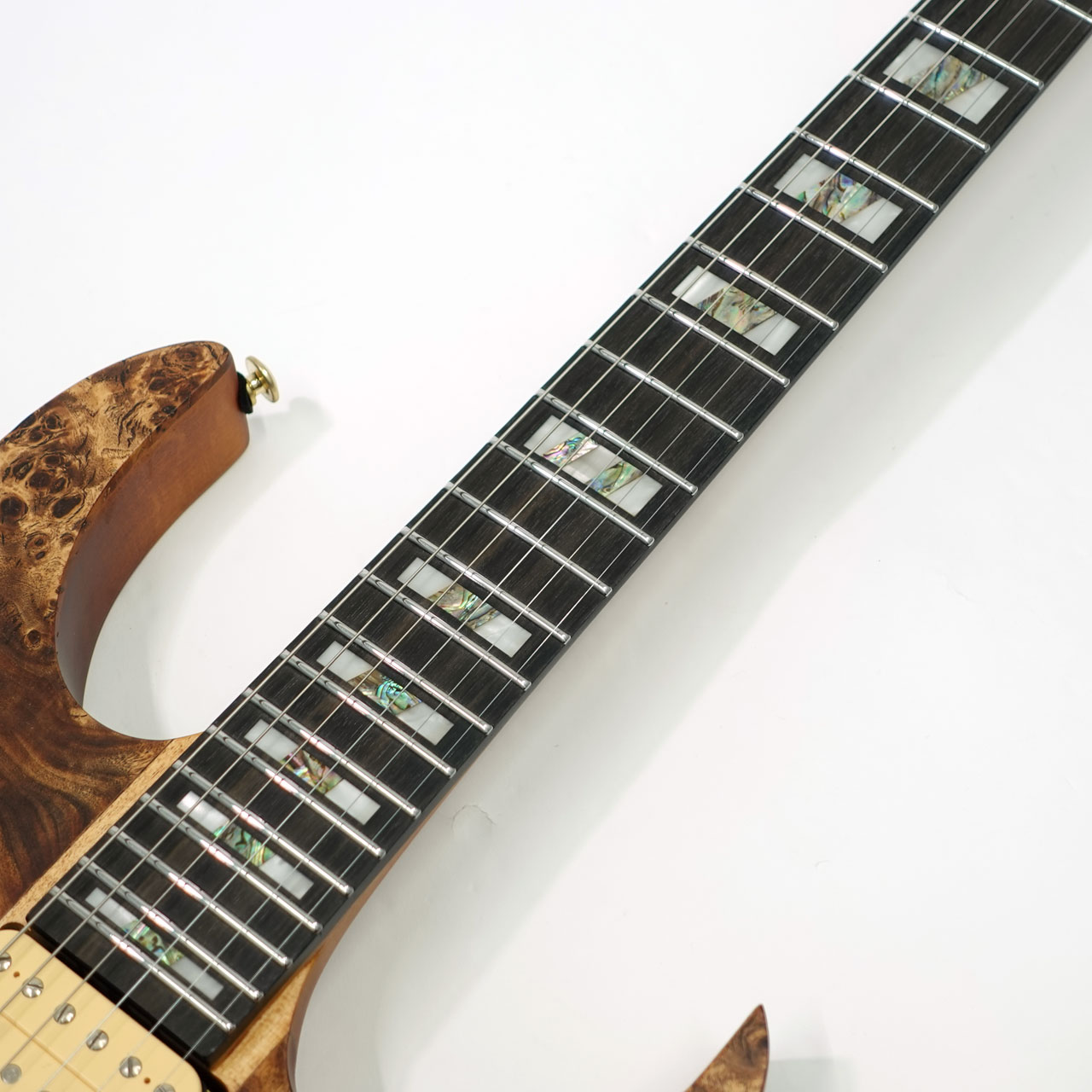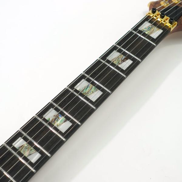 バスウッドボディにエキゾチックな杢目の出た3㎜厚のポプラ・バールトップ、メイプル材、ウォルナット材ラミネートした7プライ Wizard ネックのスルーネックにエボニー指板、ステンレスフレット採用、Gotoh製チューナーにEdge tremoloブリッジ、蓄光材サイドポジションマークなど演奏性も抜群です。