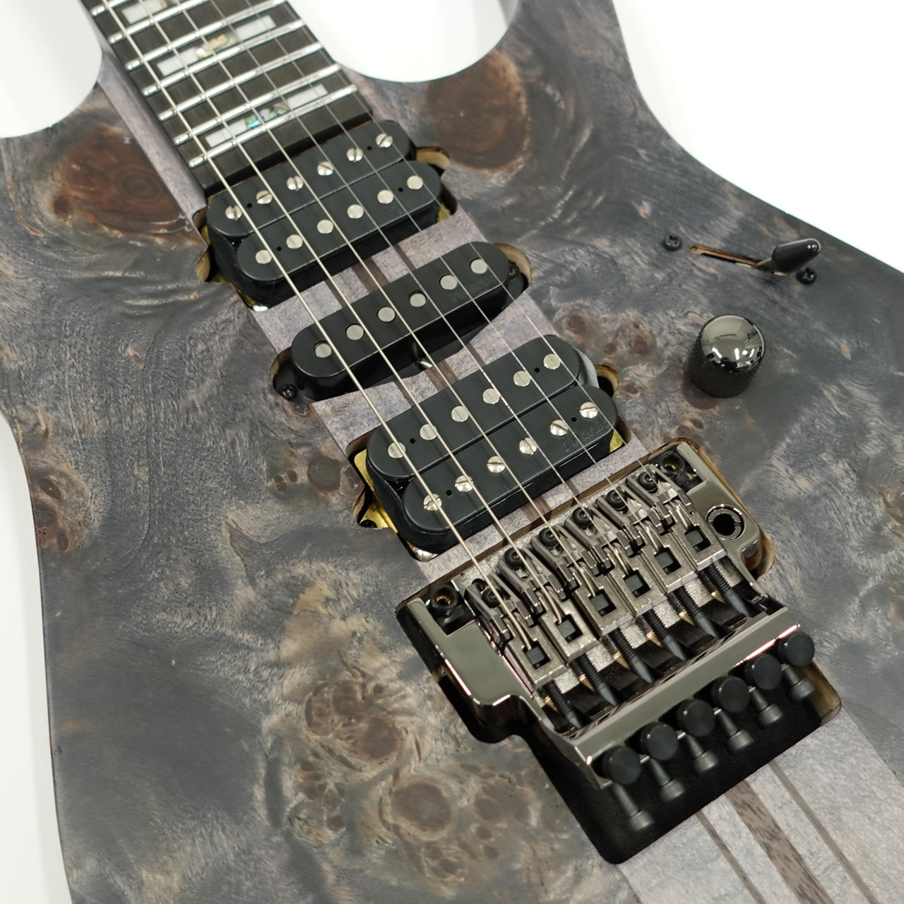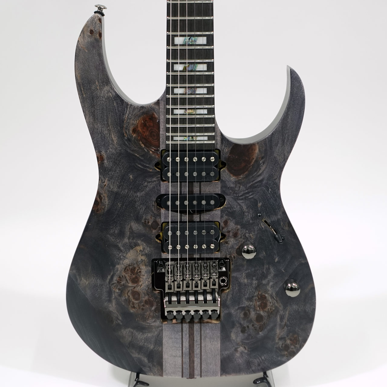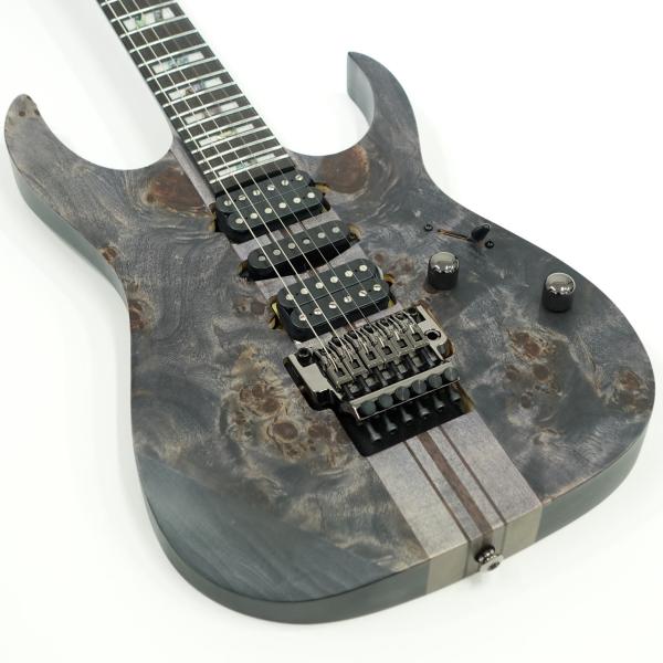バスウッドボディにエキゾチックな杢目の出た3㎜厚のポプラ・バールトップ、メイプル材、ウォルナット材ラミネートした7プライ Wizard ネックのスルーネックにエボニー指板、ステンレスフレット採用、Gotoh製チューナーにEdge tremoloブリッジ、蓄光材サイドポジションマークなど演奏性も抜群です。