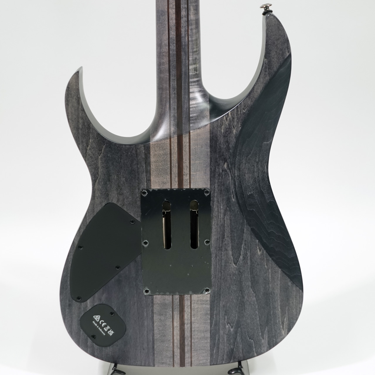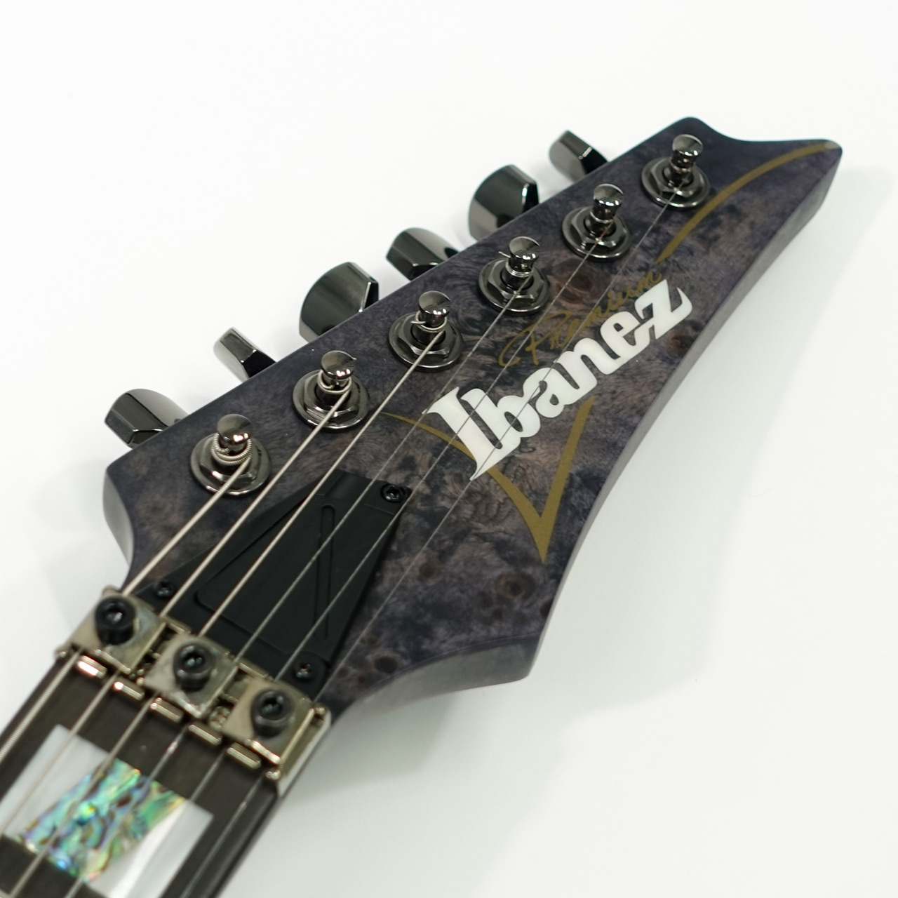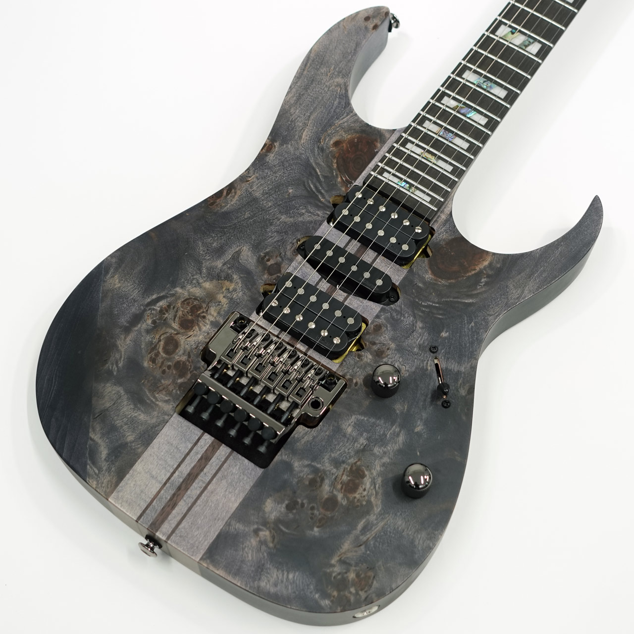 バスウッドボディにエキゾチックな杢目の出た3㎜厚のポプラ・バールトップ、メイプル材、ウォルナット材ラミネートした7プライ Wizard ネックのスルーネックにエボニー指板、ステンレスフレット採用、Gotoh製チューナーにEdge tremoloブリッジ、蓄光材サイドポジションマークなど演奏性も抜群です。