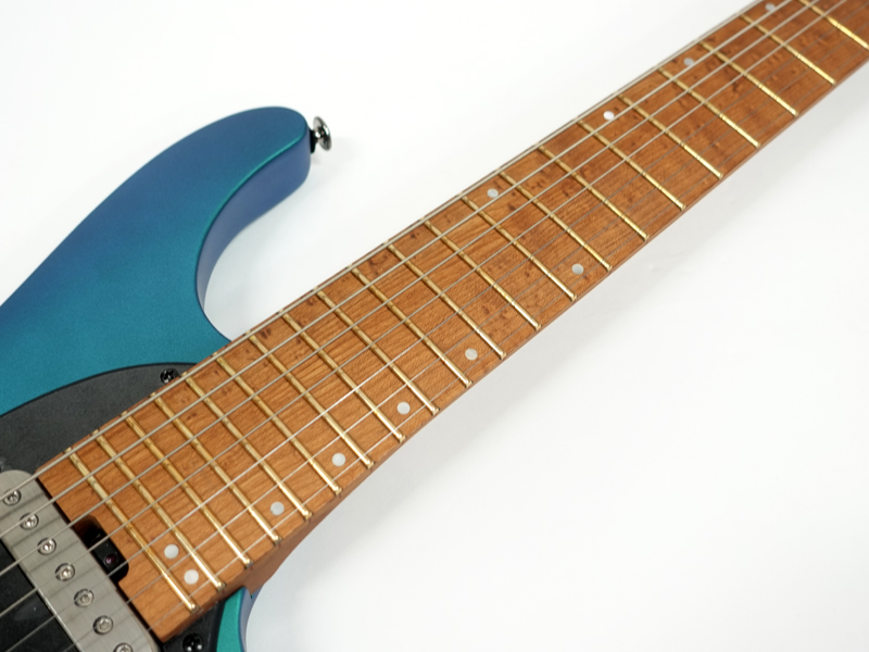 ローステッドメイプルとブビンガの硬質な3Pネックにローステッドバーズアイメイプル指板を採用、ネックシェイプは様々な演奏スタイルに対応できるよう、”厚すぎず””薄すぎない”標準的なネックシェイプです。フレットにはゴージャスなゴールドのルックスのJescar EVOフレットを採用し、明るいトーンと高い耐久性を持ちます。