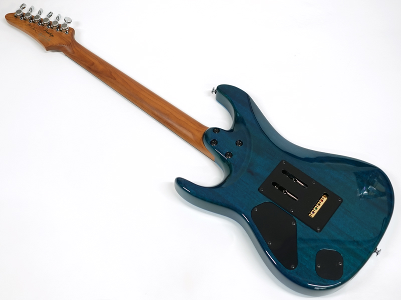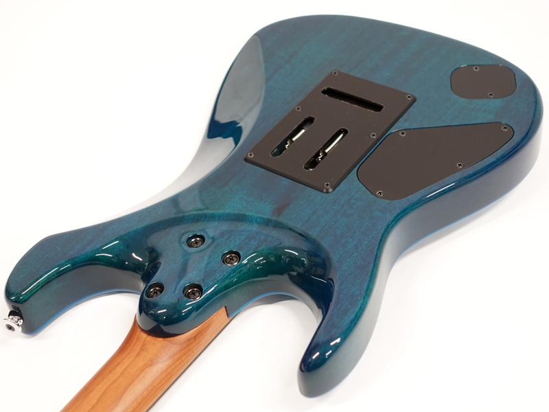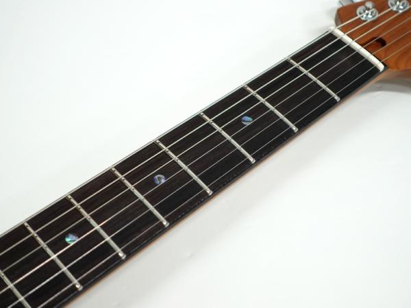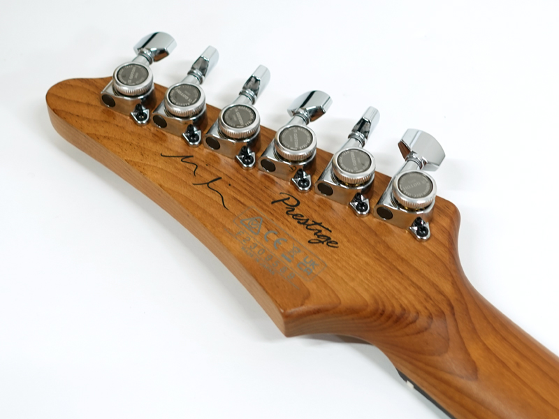 GOTOH製マグナムロックペグ、シンクロトレモロ、ステンレスフレット、ボディのコンターやネックジョイント部の球面仕上げ、蓄光素材のサイドポジションマークなど現代的な演奏性の高さを求めてひと手間ふた手間かけた拘りの感じられる一本。