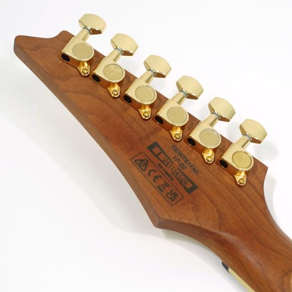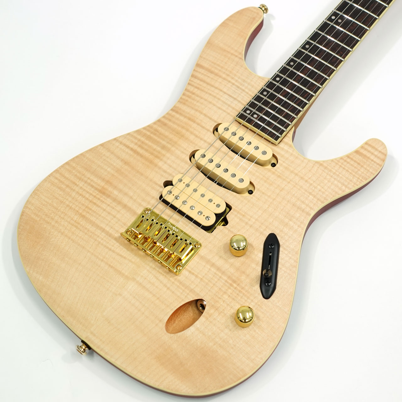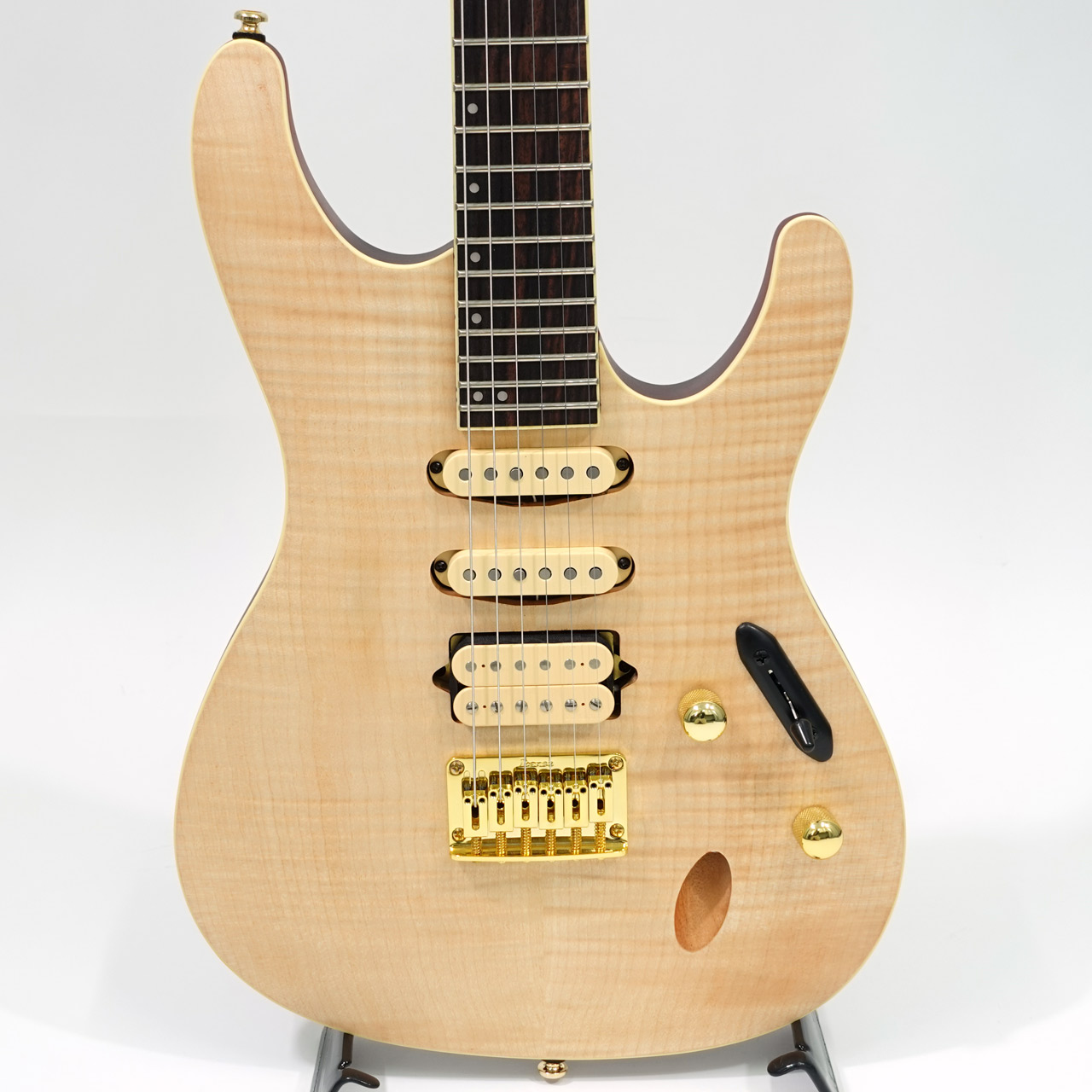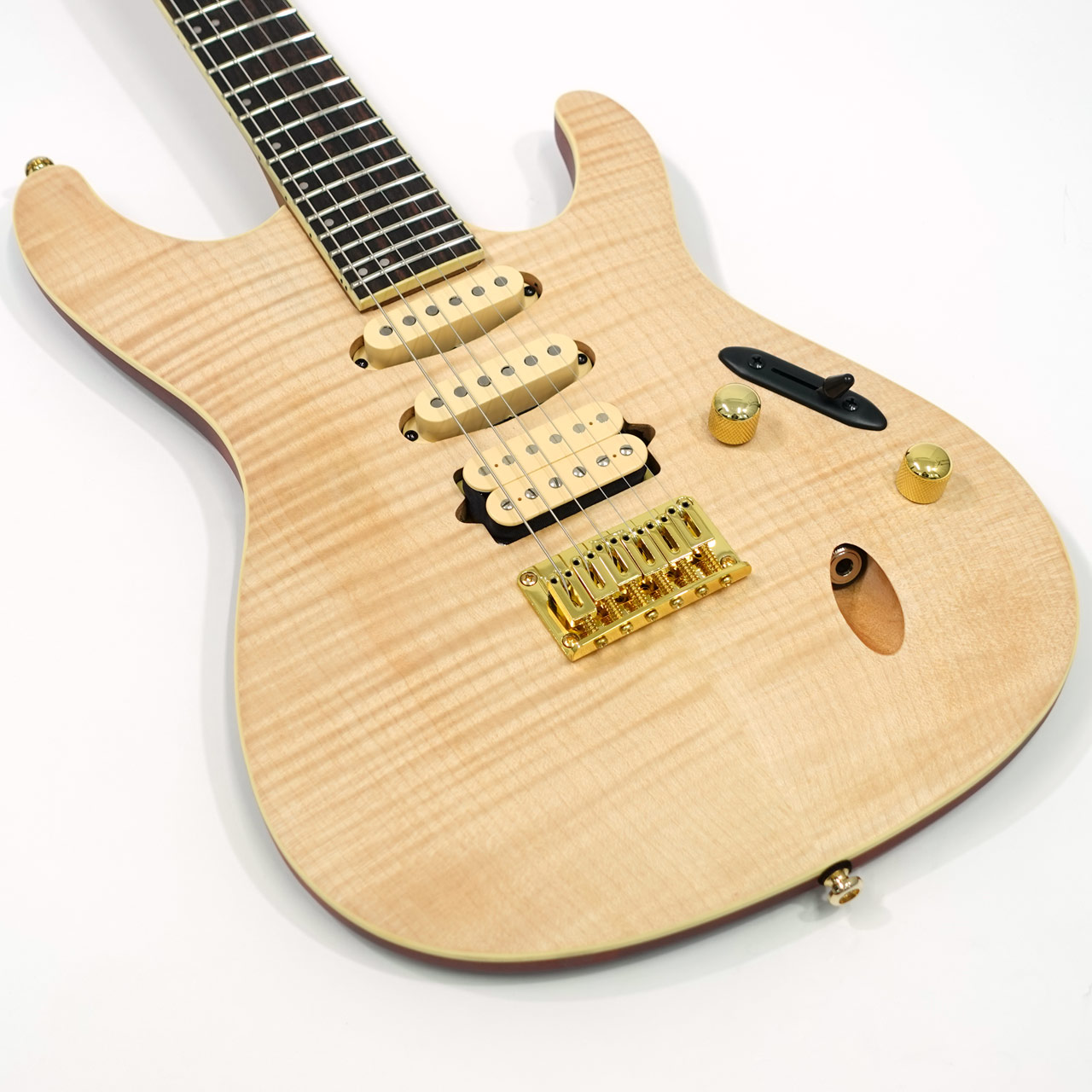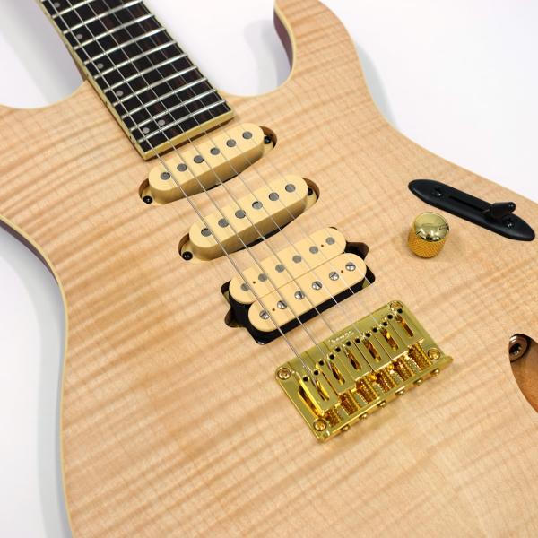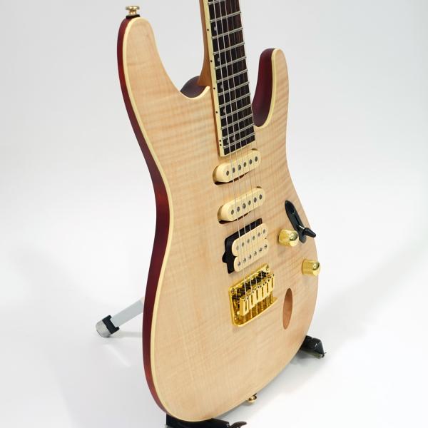 トップ、バックともに美しい曲線を描き極限まで薄く成形されたボディ・スタイル。美しいフレイムメイプルトップ、メランティボディが生み出すファットでレゾナンス豊かなトーン。ゴールドパーツと合わせてルックスもゴージャスですネ