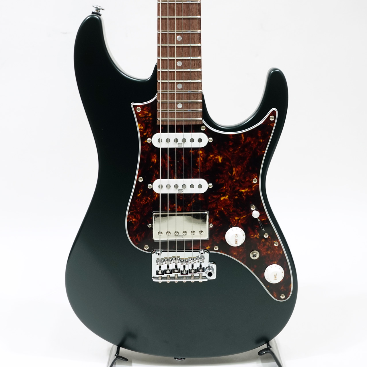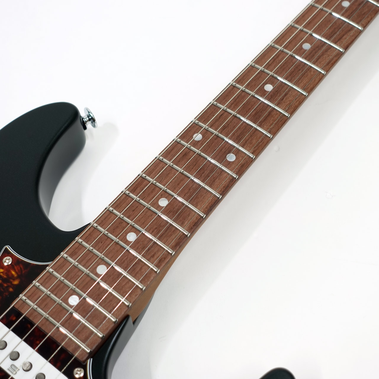 GOTOH製マグナムロックペグ、シンクロトレモロ、ステンレスフレット、ボディのコンターやネックジョイント部の球面仕上げ、蓄光素材のサイドポジションマークなど現代的な演奏性の高さを求めてひと手間ふた手間かけた拘りの感じられる一本。