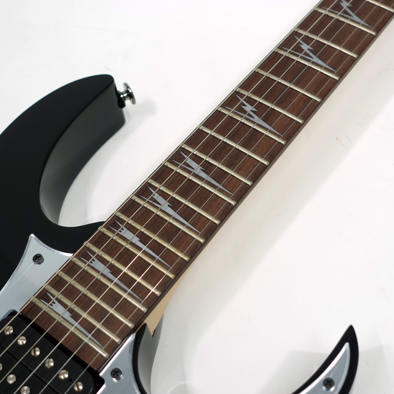 指板のポジションマークにシャークトゥースインレイを採用。
