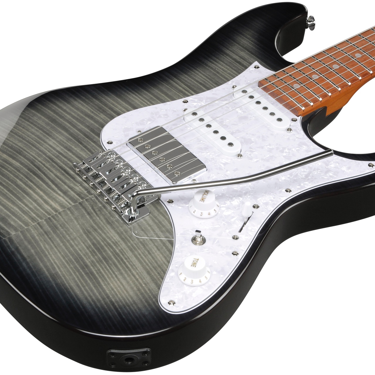 バランスの取れた明るいトーン特性と豊かなサスティーンが特長のアルダー材に、杢目が美しいフレイム・メイプル材を組み合わせています。