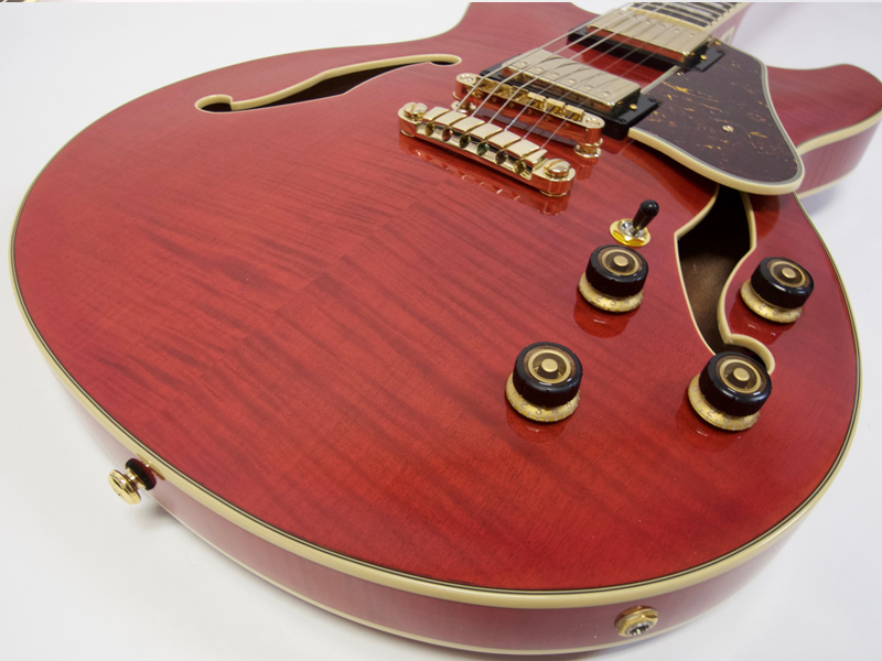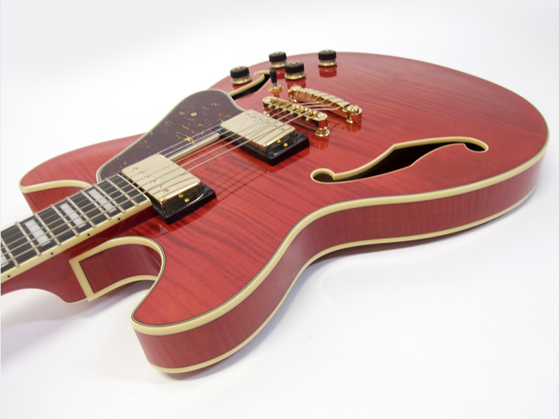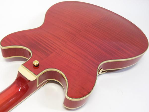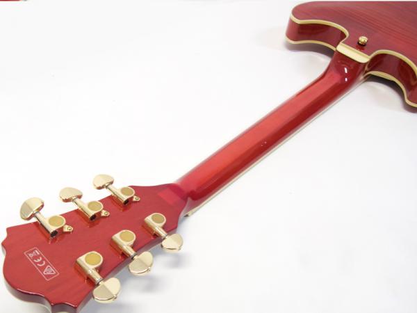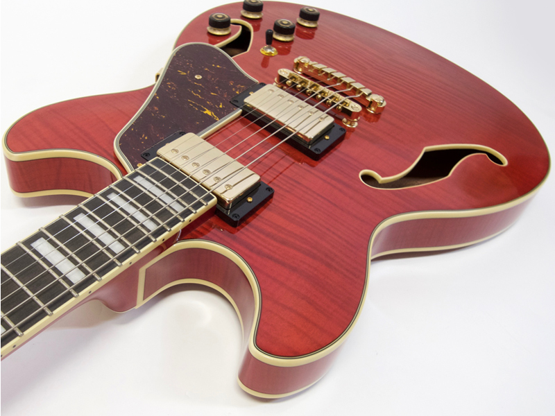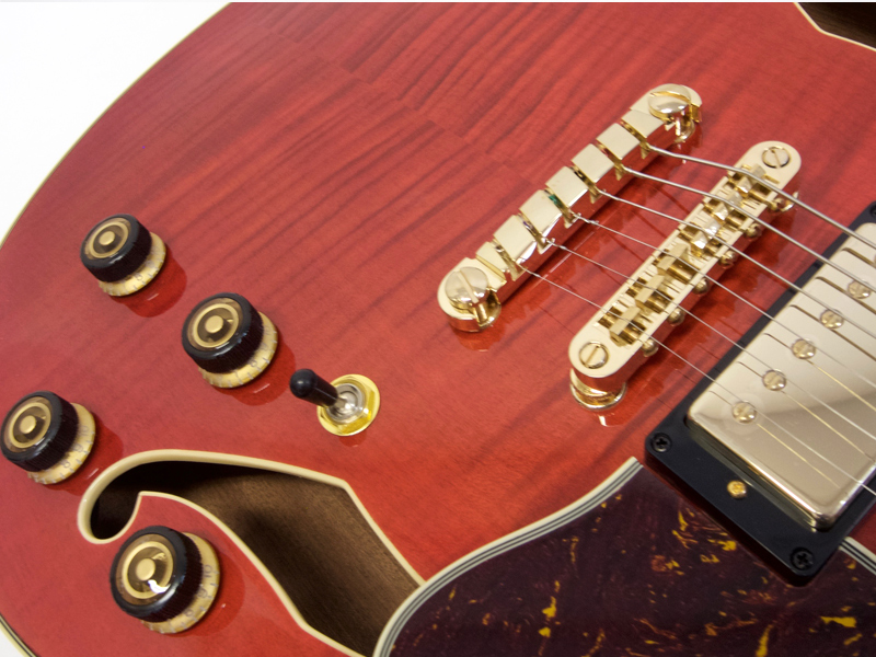 フレイムメイプルボディにシースルーレッド、そしてゴールドパーツと渋めでゴージャスなルックス。