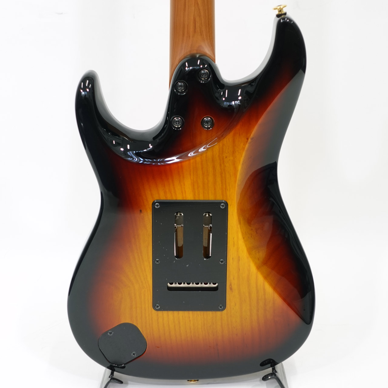 GOTOH製マグナムロックペグ、シンクロトレモロ、ステンレスフレット、ボディのコンターやネックジョイント部の球面仕上げ、蓄光素材のサイドポジションマークなど現代的な演奏性の高さを求めてひと手間ふた手間かけた拘りの感じられる一本。