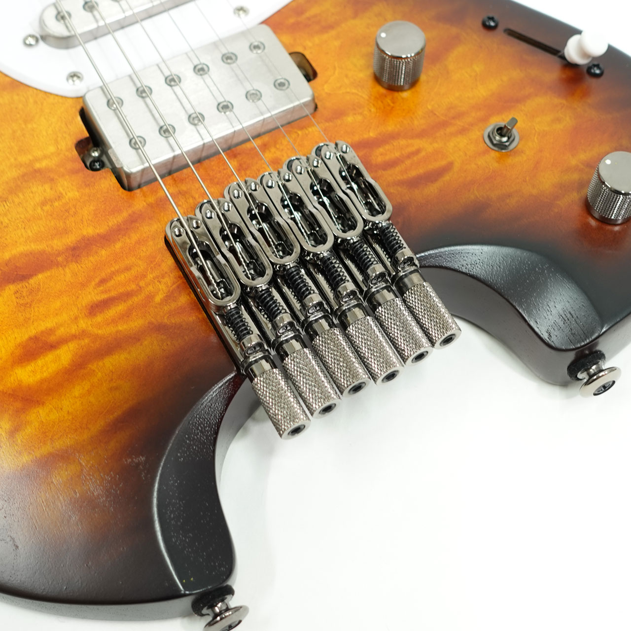 ローステッドメイプルとブビンガの硬質な3Pネックにローステッドバーズアイメイプル指板を採用、ネックシェイプは様々な演奏スタイルに対応できる厚すぎず薄すぎない、馴染みやすいネックです。フレットにはジャンボステンレスフレットを採用し高い耐久性を持ちます。