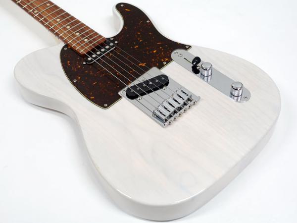 アッシュボディにシースルーホワイト(ブロンド)のフィニッシュ、パーフェロー指板にベッコウ柄ピックガード、