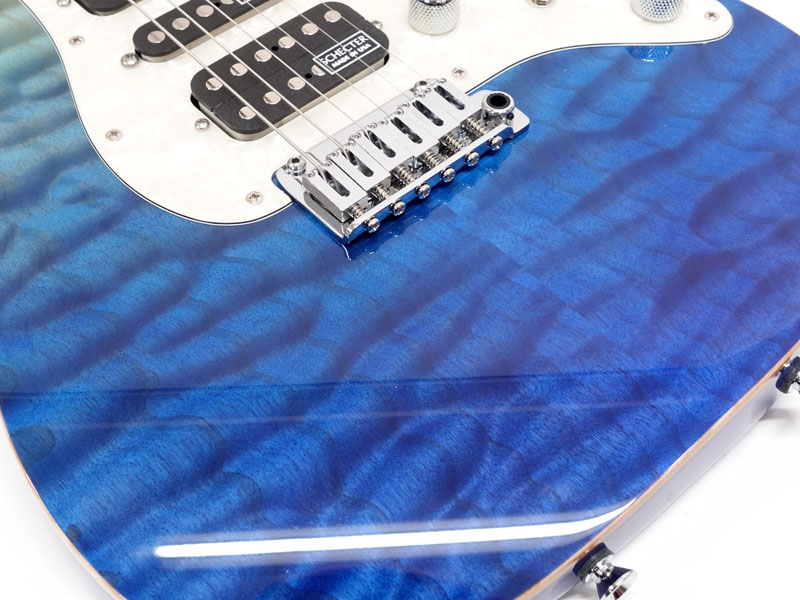 まさしくこれこそ玉杢というにふさわしい5Aキルテッドメイプルを採用したトップは角度によって表情を変えるプレミアムなルックスに、ボディバックにはセレクトされたライトアッシュ、更にネックにも密に鳥眼杢の入ったバーズアイメイプルにバーズアイメイプル指板というスペシャルならではの贅沢なモデルです。