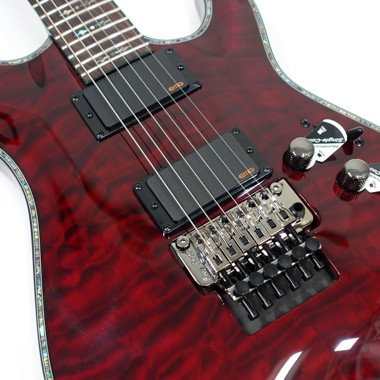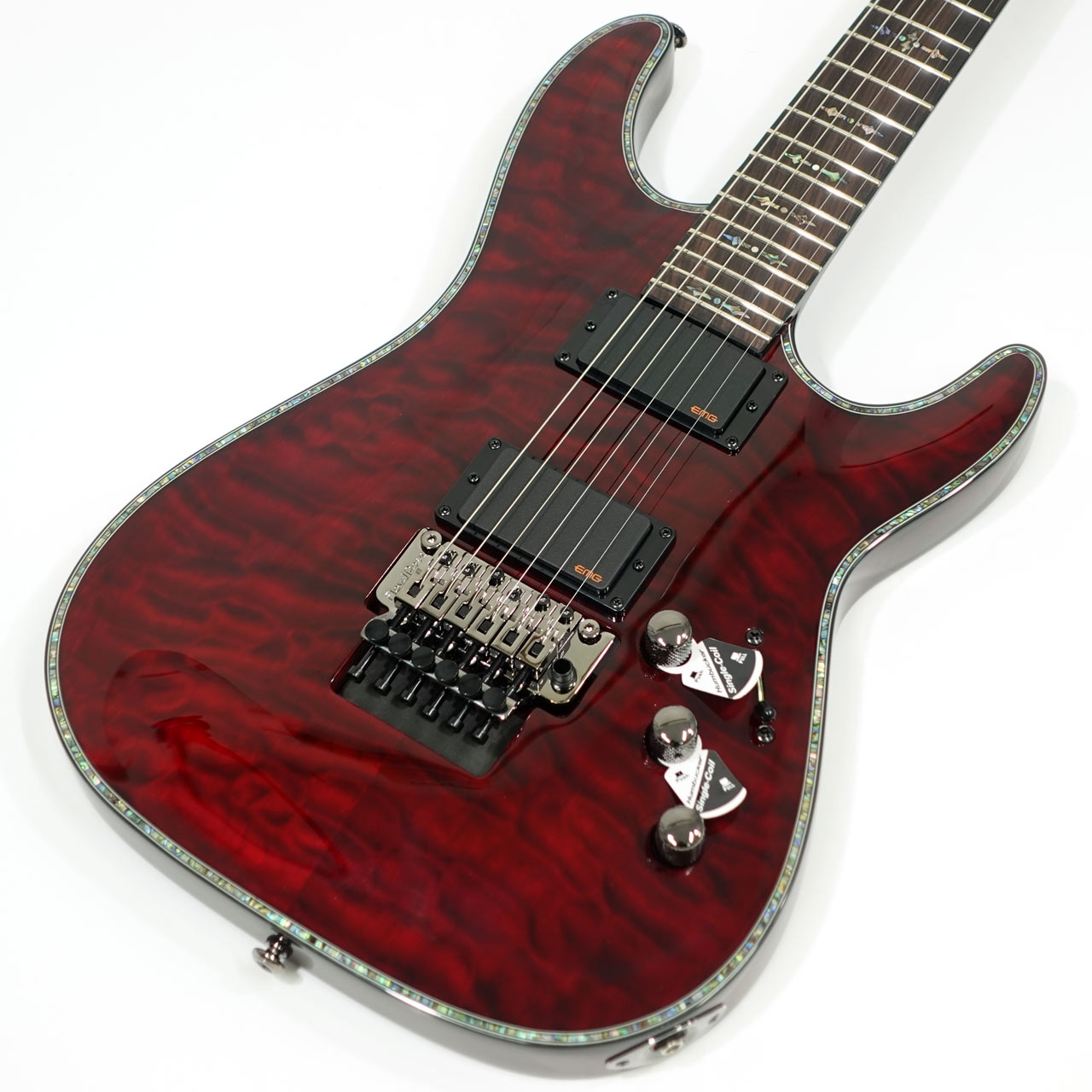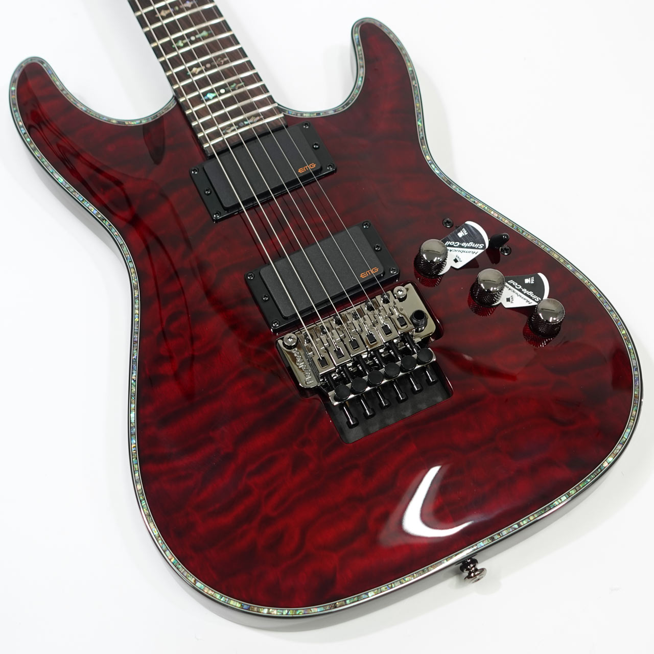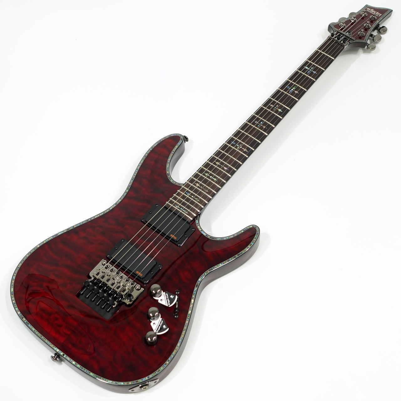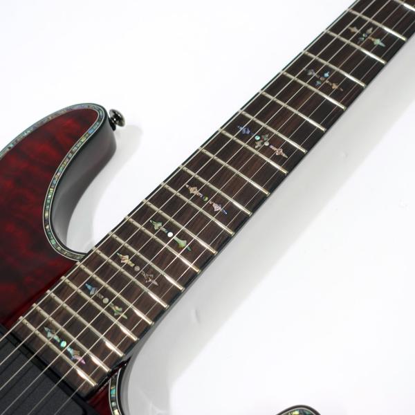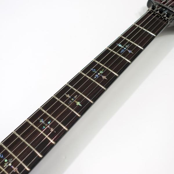 キルテッドメイプルトップ、マホガニーボディ、マホガニーネック、ローズウッド指板、EMGピックアップやフロイドローズによる自由なアーミング、コイルタップなど、盤石のスペックを採用!