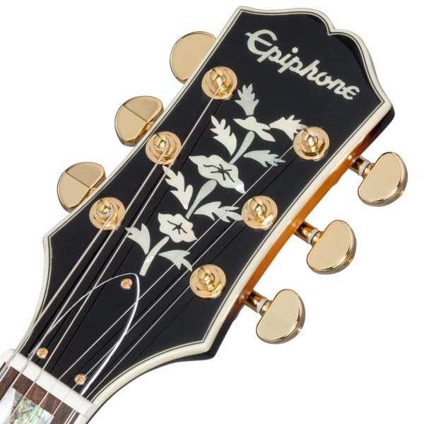バインディングやザーオブパールのブロックインレイ、豪華なツリーオブライフのヘッドインレイやゴールドパーツと高級感あふれる仕上がりです。