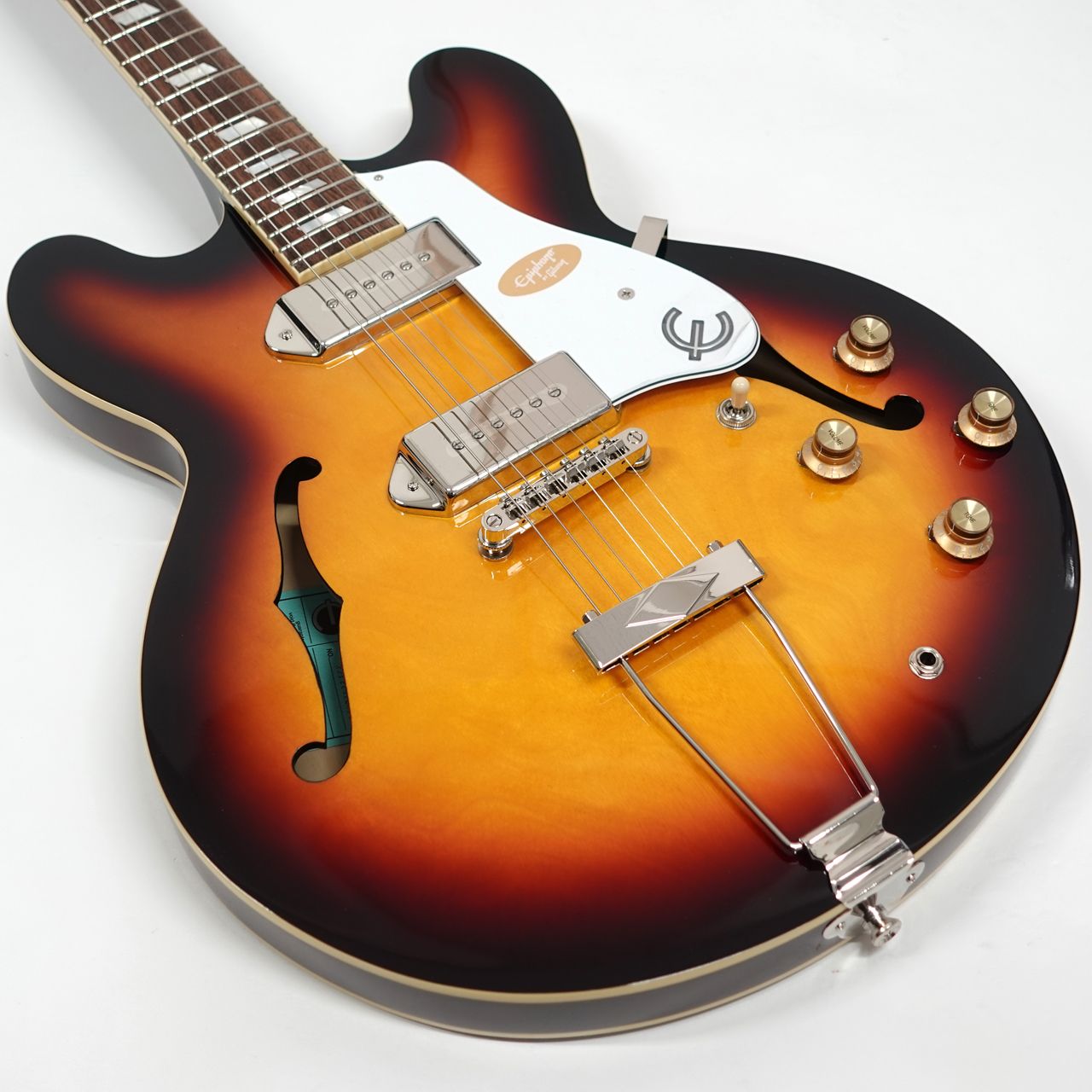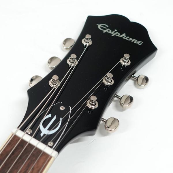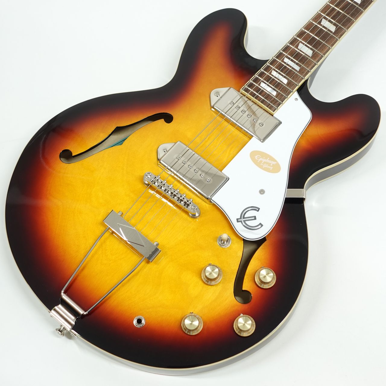 ジョンレノン等の愛用でカジノと言えばエピフォン、エピフォンと言えばカジノというくらいの代表選手。(もちろんご本人はUSAメイド、掲載のモデルではありません)ハムバッカーとはひと味ちがう金属カバーのP90シングルコイルピックアップ搭載、すでに独特の雰囲気を持つスタイル。薄胴ボディのセミアコルックスですが、センターブロックがないフルアコ構造ですので軽量で335とはまた違った響きが得られます。