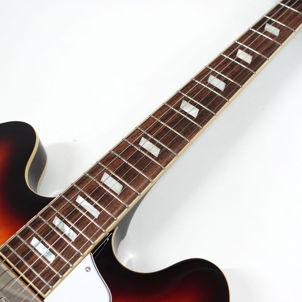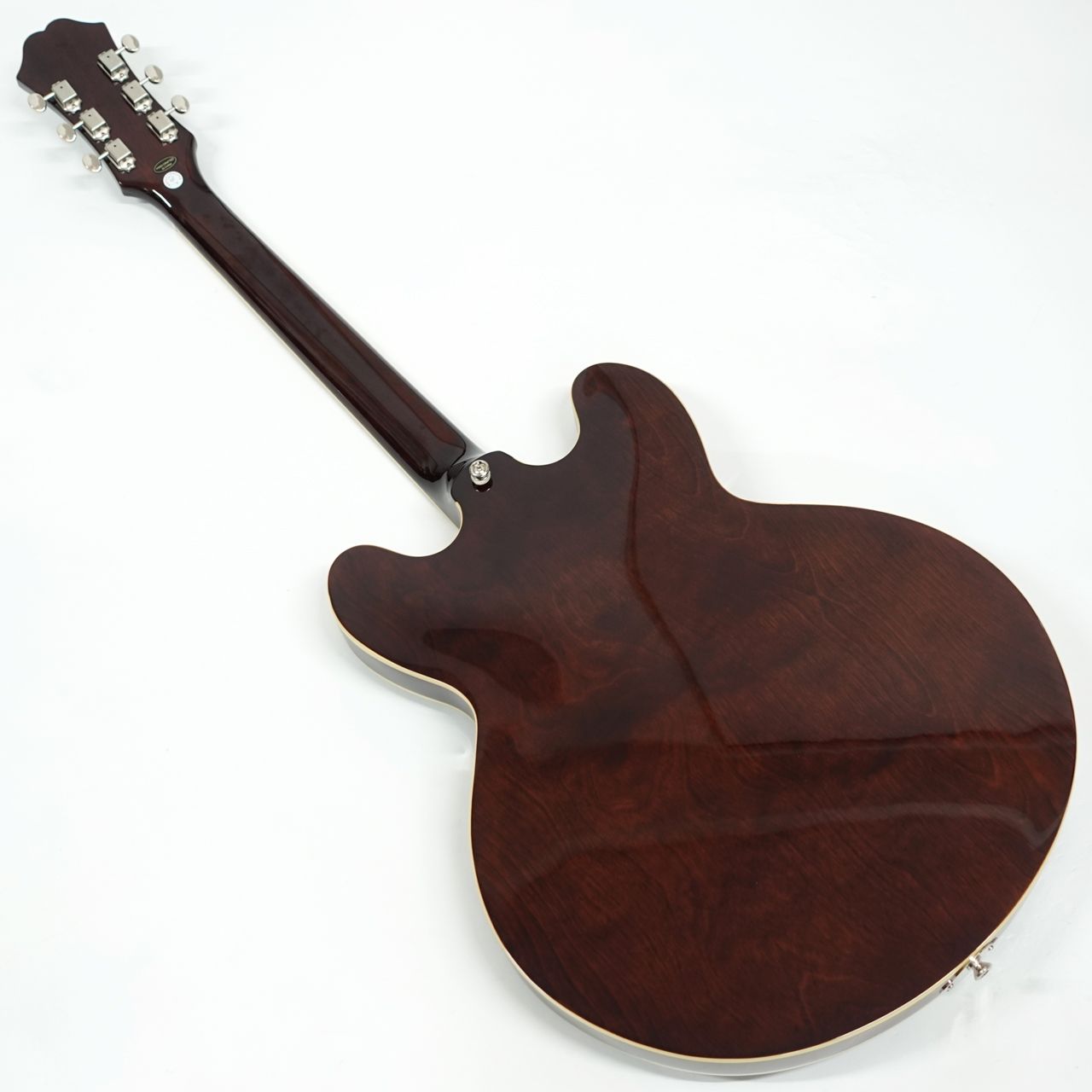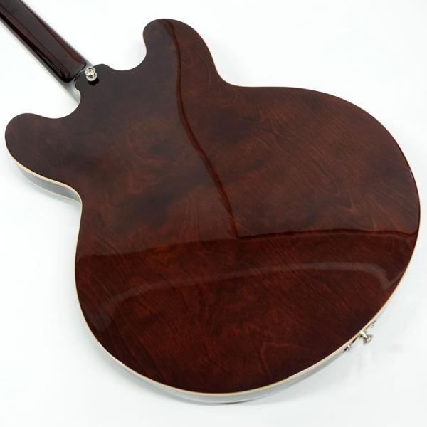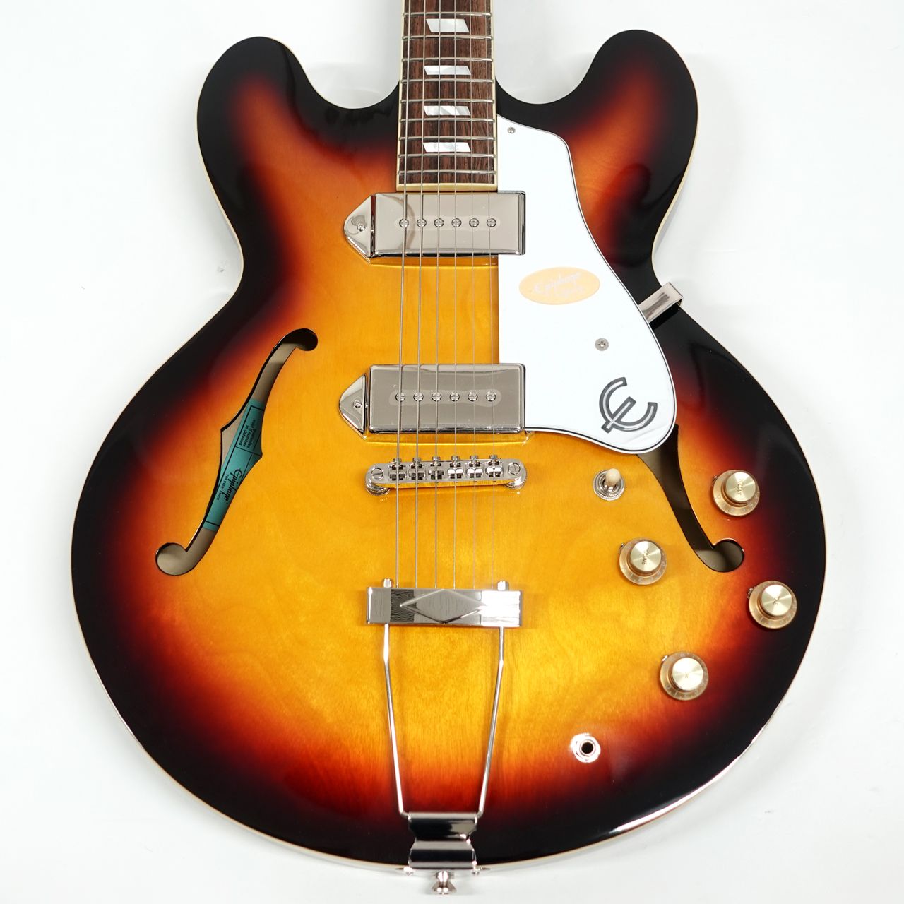 ジョンレノン等の愛用でカジノと言えばエピフォン、エピフォンと言えばカジノというくらいの代表選手。(もちろんご本人はUSAメイド、掲載のモデルではありません)ハムバッカーとはひと味ちがう金属カバーのP90シングルコイルピックアップ搭載、すでに独特の雰囲気を持つスタイル。薄胴ボディのセミアコルックスですが、センターブロックがないフルアコ構造ですので軽量で335とはまた違った響きが得られます。