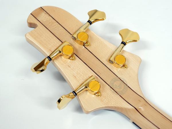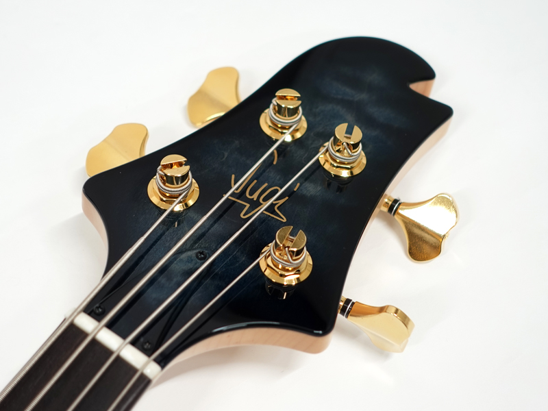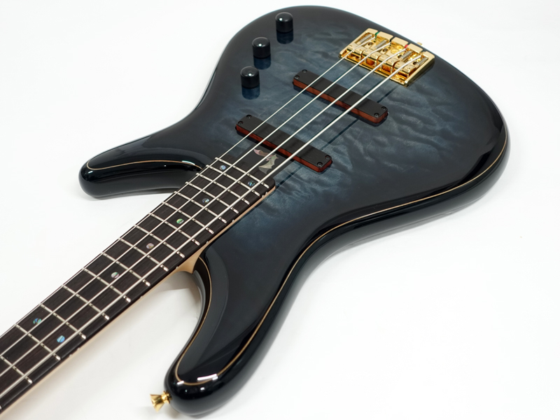 本モデルはトップにエキゾチックな美しい杢目をもつフィギュアドメイプルを、バックにアッシュ材を採用したスタンダード4弦モデルです。深い色味のブルーのバーストにゴールドパーツという組み合わせです。