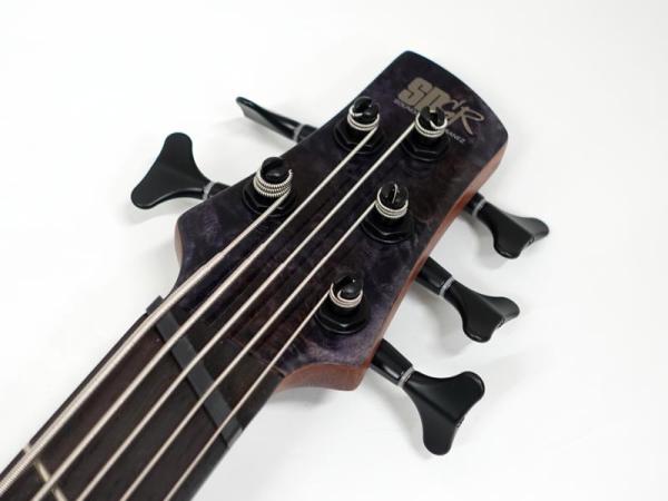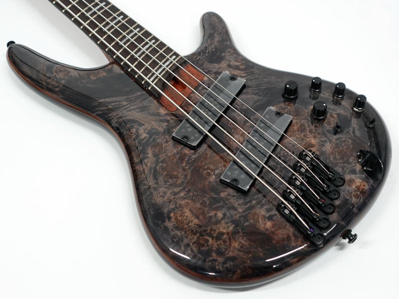 エキゾチックなポプラバールトップにオクメバック、間にウォルナットを挟み込んだ3プライのボディにウォルナットと硬質なジャトバの5ピースのSRスリムネック、指板にはパンガパンガを採用します。パンガパンガはタンザニア産のマメ科の木で、見た目や比重はウェンジによく似ています。